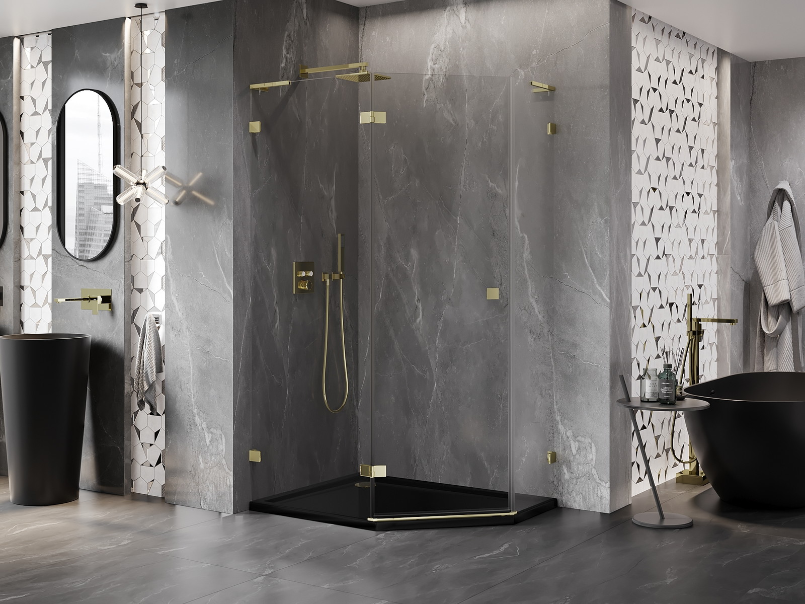Mexen Lunar L sprchový kout pětiúhelníkový otočný levý 100 x 80 cm, transparentní, zlatý - 831L-100L-080P-50-00-L