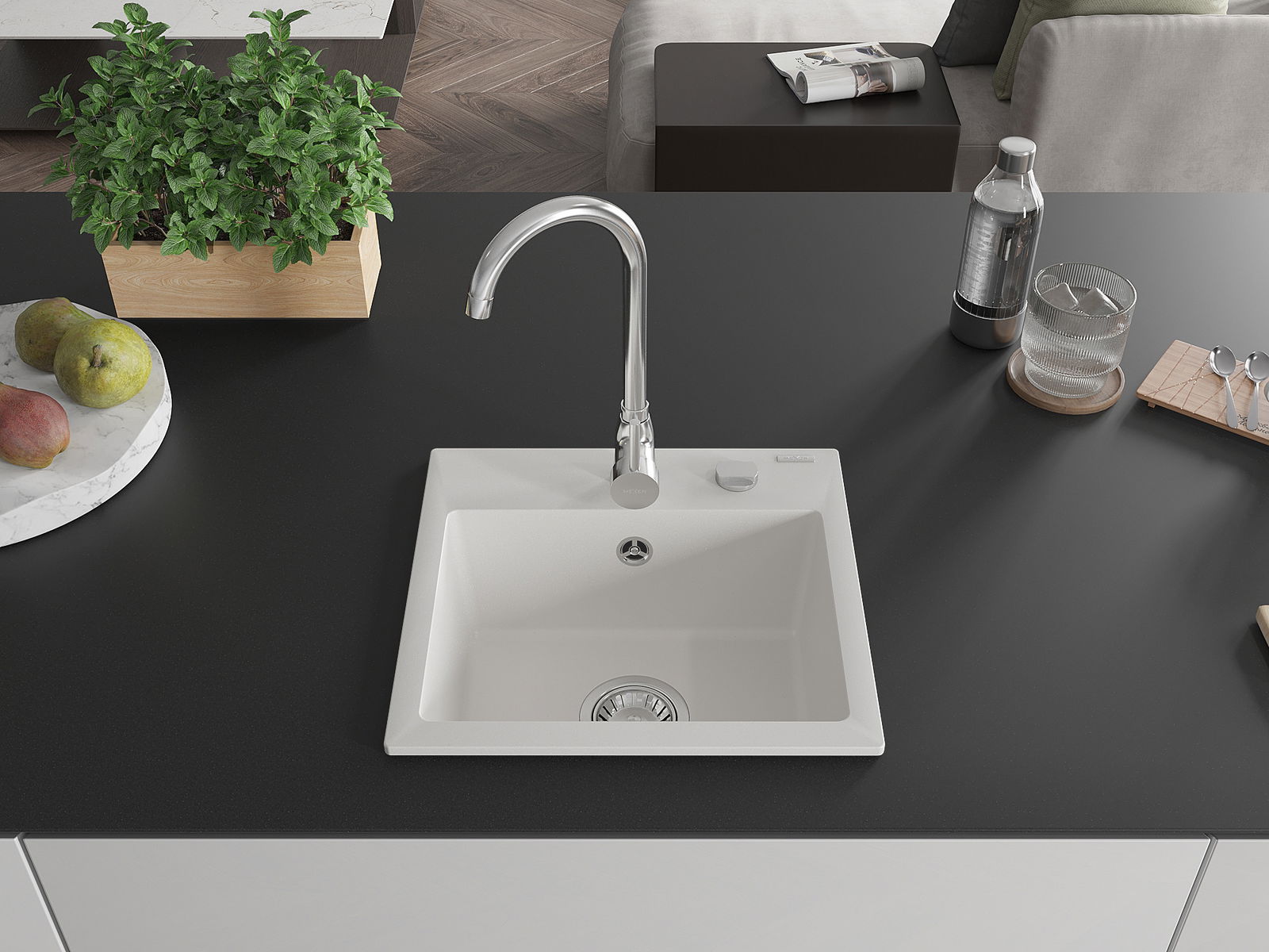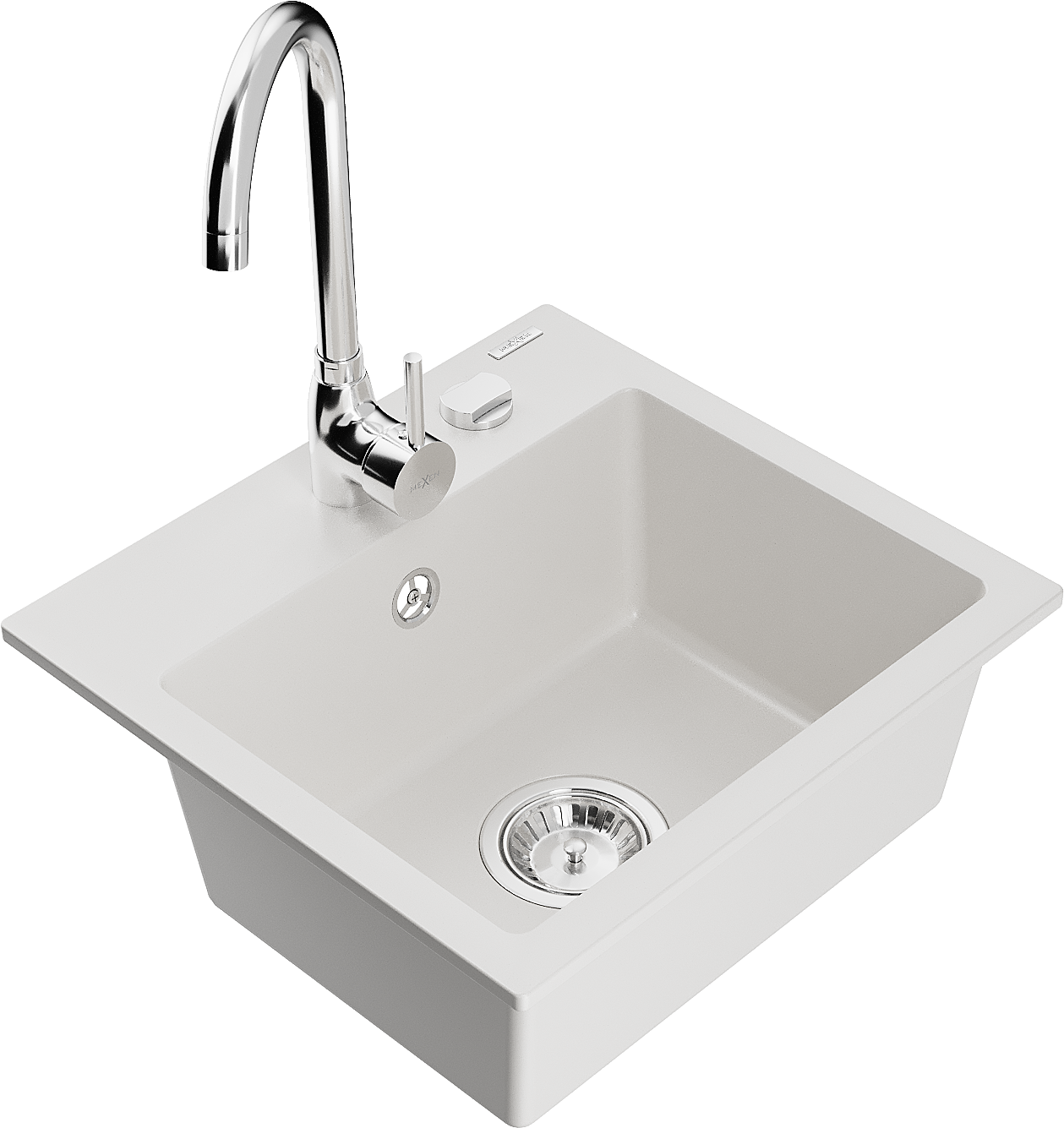 Mexen Milo žulový kuchyňský dřez s 1 komorou a kuchyňskou baterií Telma, bílý - 6505-20-670200-00