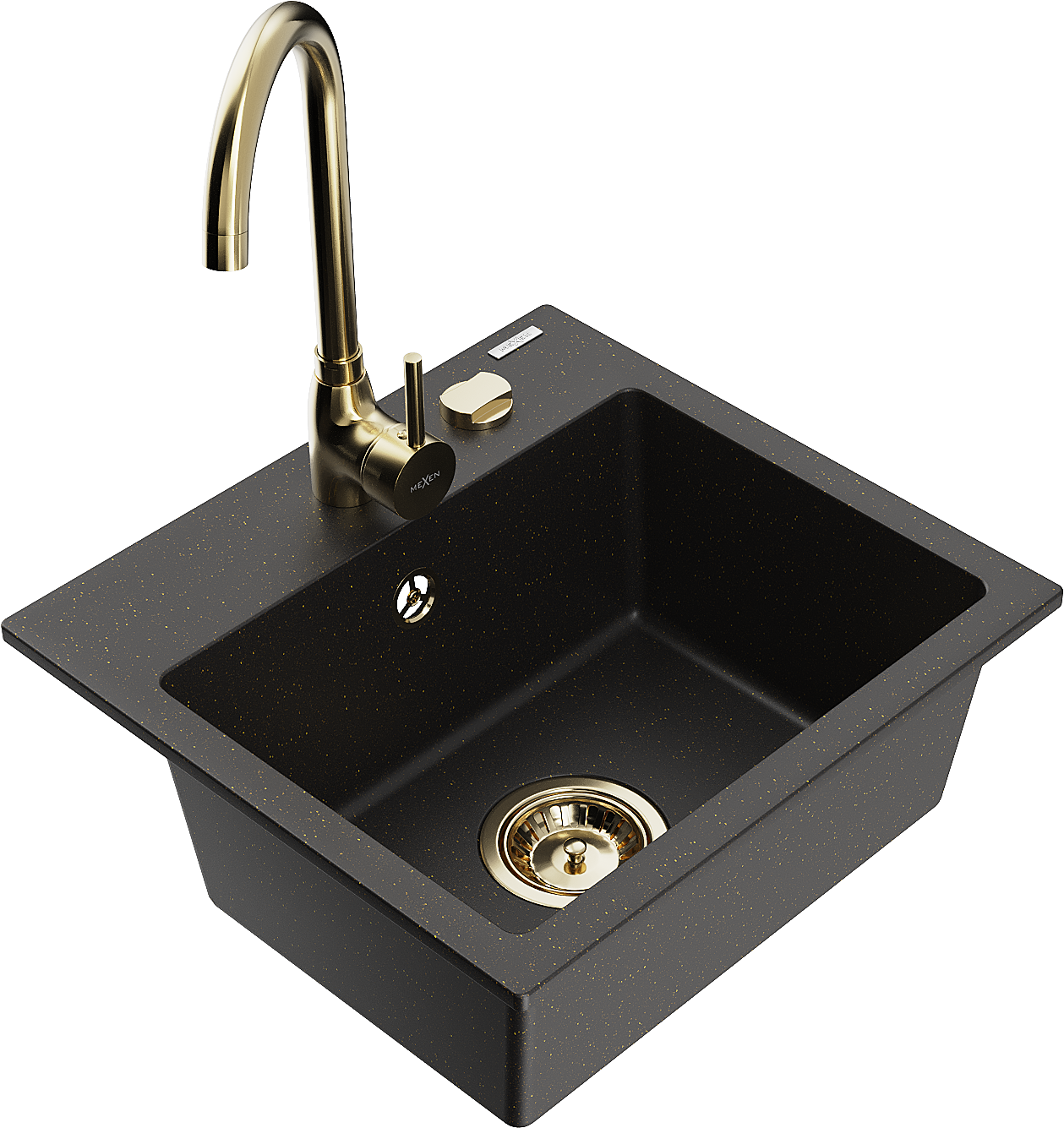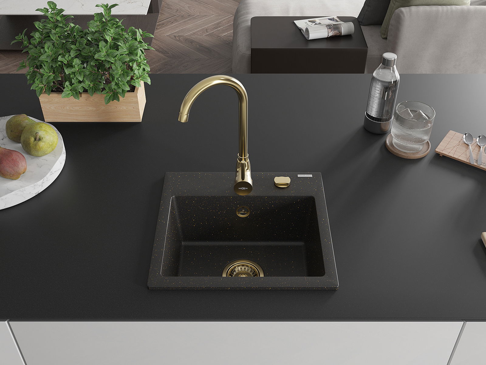 Mexen Milo granitový dřez 1-komorový s kuchyňskou baterií Telma, černý/zlatý - 6505-75-670200-50