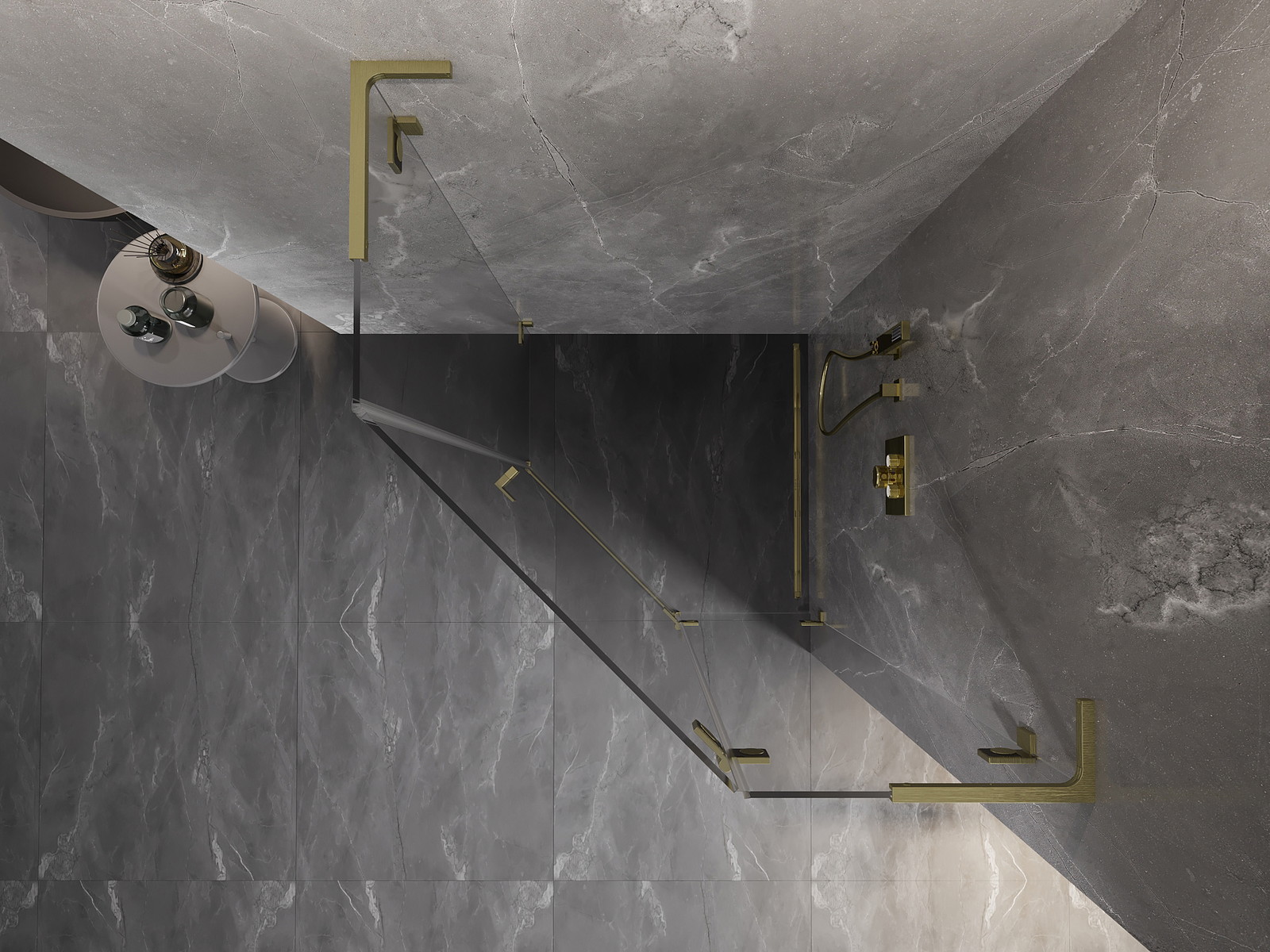 Mexen Lunar L sprchový kout pětiúhelníkový otočný pravý 90 x 90 cm, transparentní, zlatý kartáčovaný