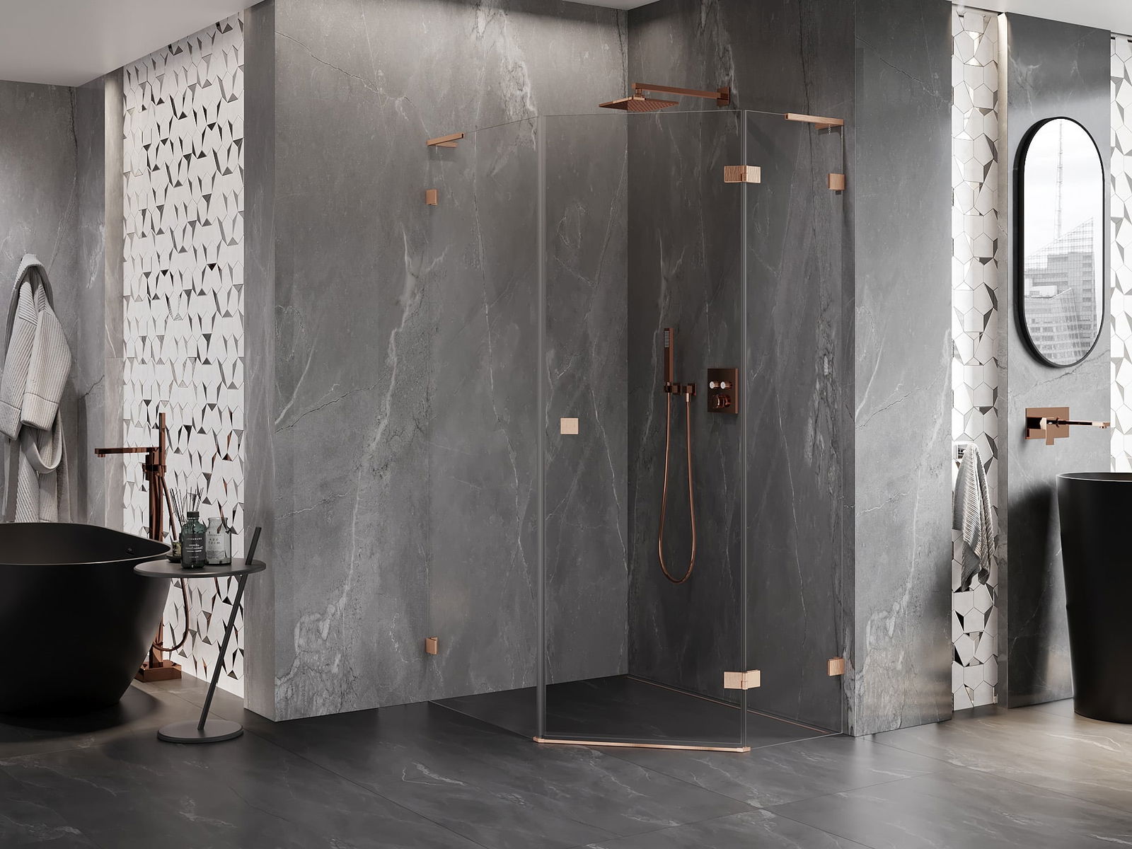 Mexen Lunar L pětiúhelníkový sprchový kout pravý 80 x 100 cm, transparentní, kartáčovaná měď - 831L-080P-100L-65-00-P