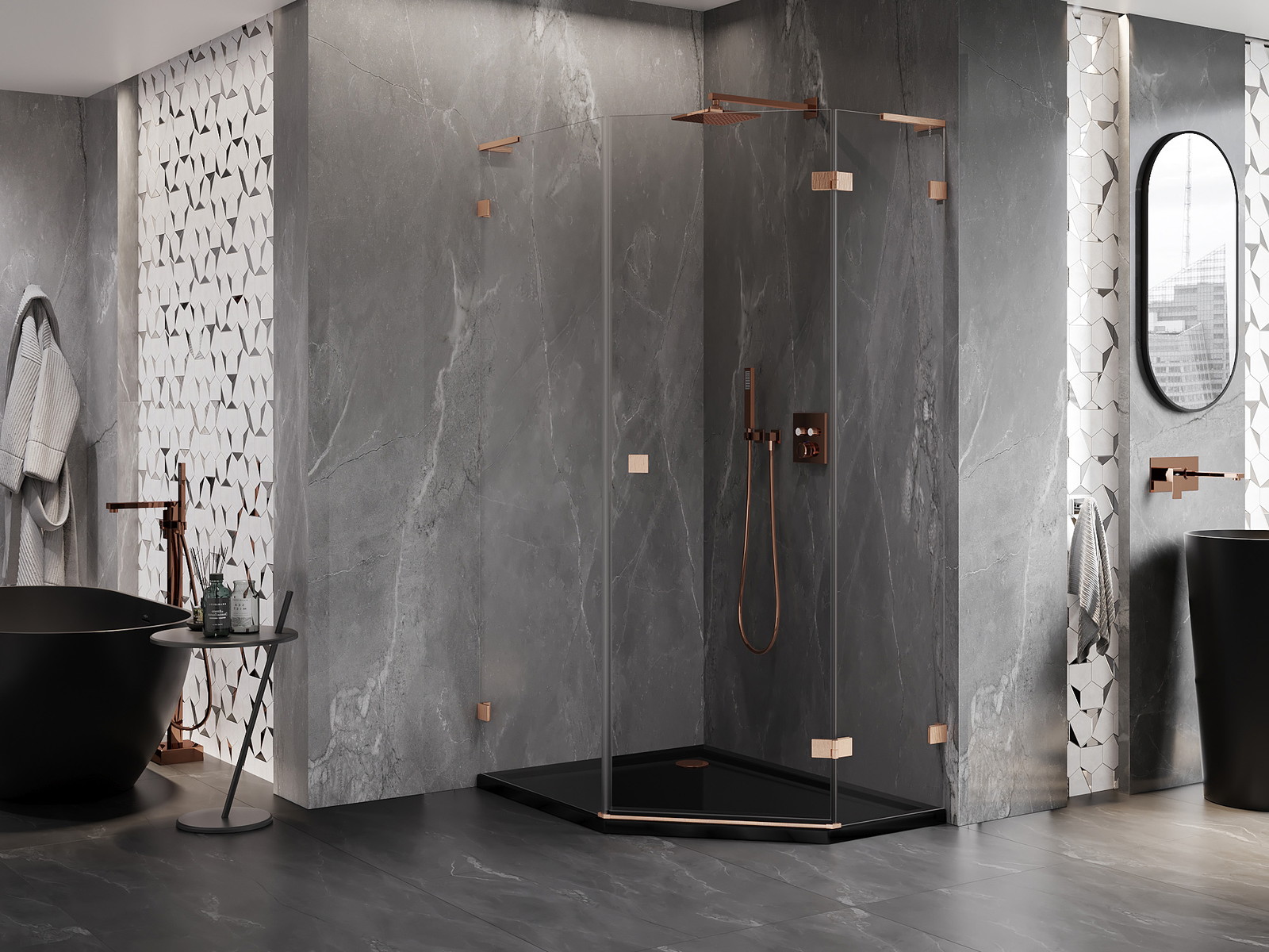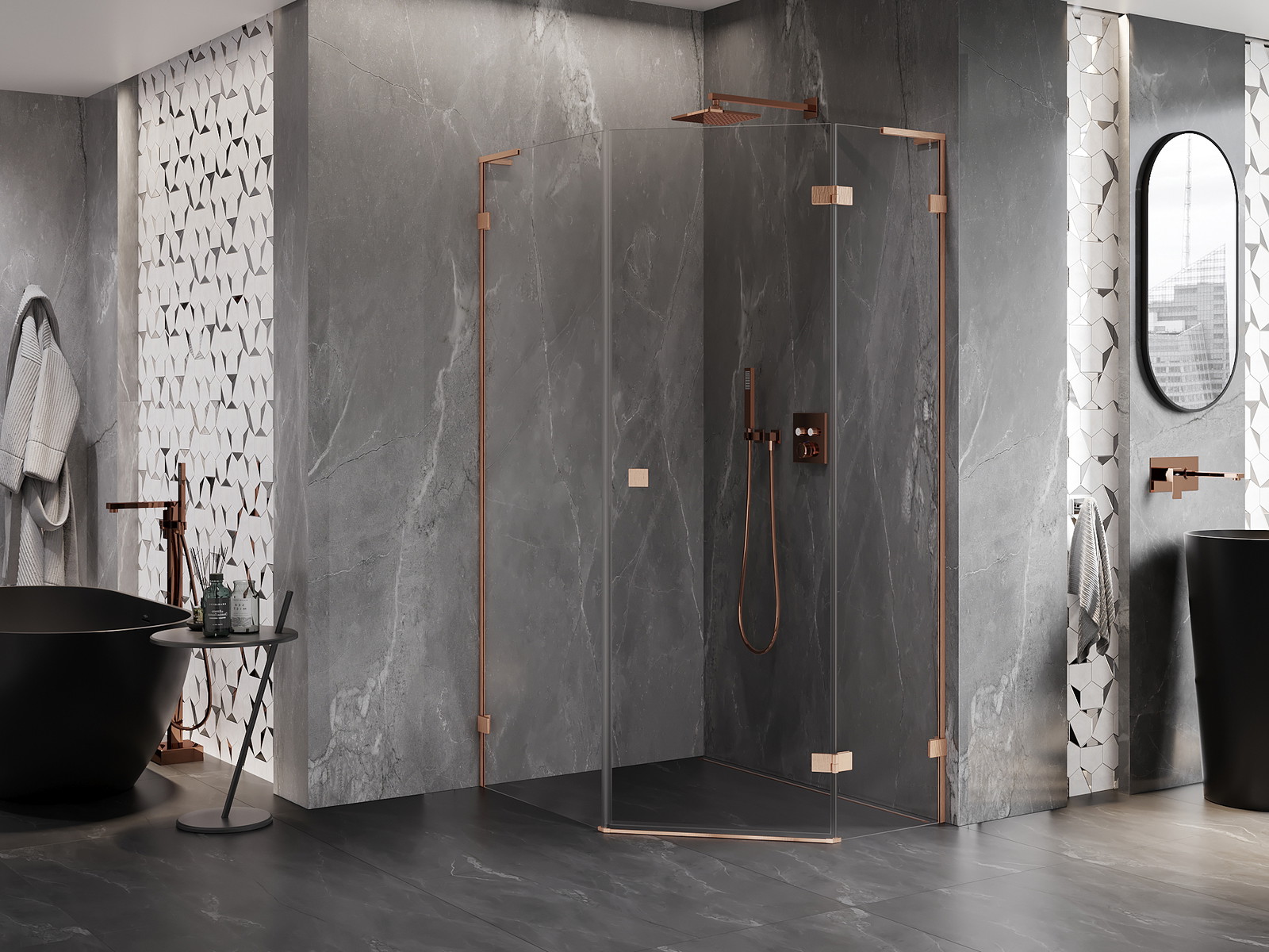 Mexen Lunar L Sprchová kabina pětiúhelníková otočná pravá 90 x 100 cm, transparentní, kartáčovaná měď