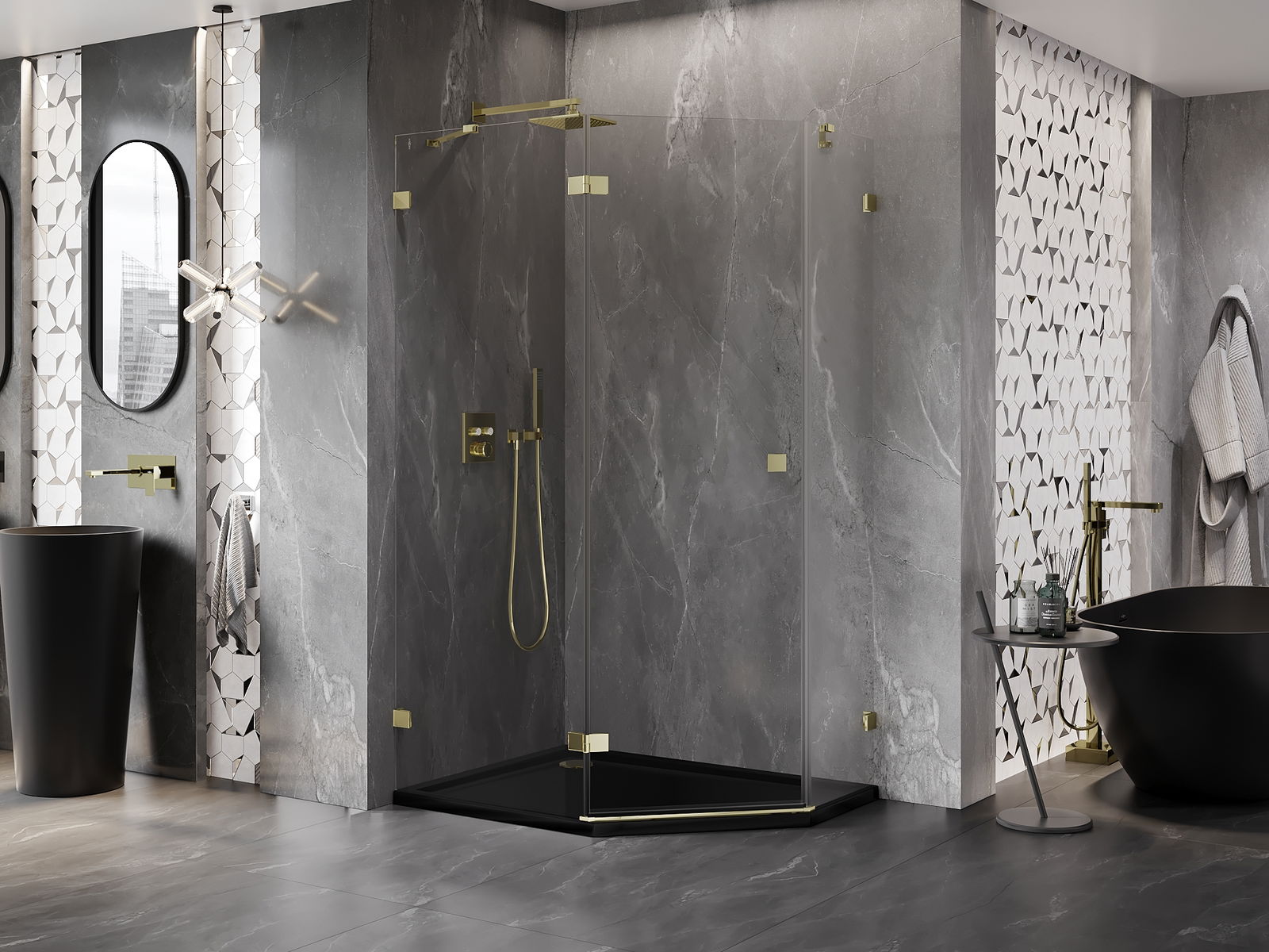 Mexen Lunar pětiúhelníková sprchová kabina s otevíráním vlevo 90 x 80 cm, transparentní, zlatá - 831-090L-080P-50-00-L