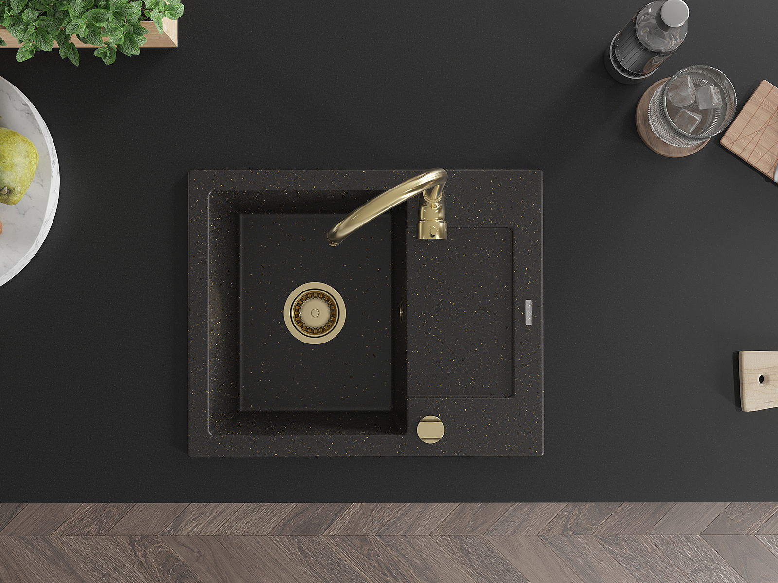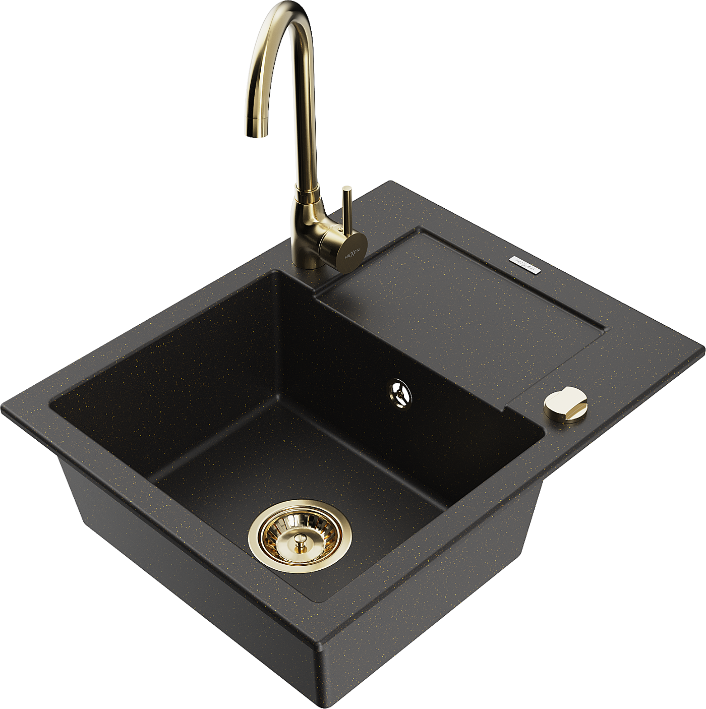 Mexen Enzo granitový dřez s 1 komorou a odkapávačem a kuchyňskou baterií Telma, černá/zlatá - 6506-75-670200-50