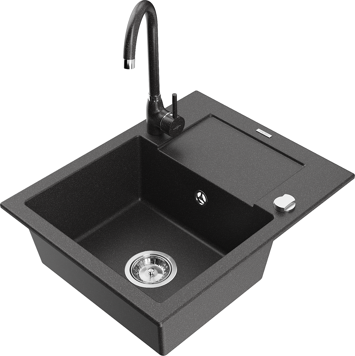 Mexen Enzo granitový dřez 1-komorový s odkapávačem a kuchyňskou baterií Telma, černý skvrnitý - 6506-76-670200-76