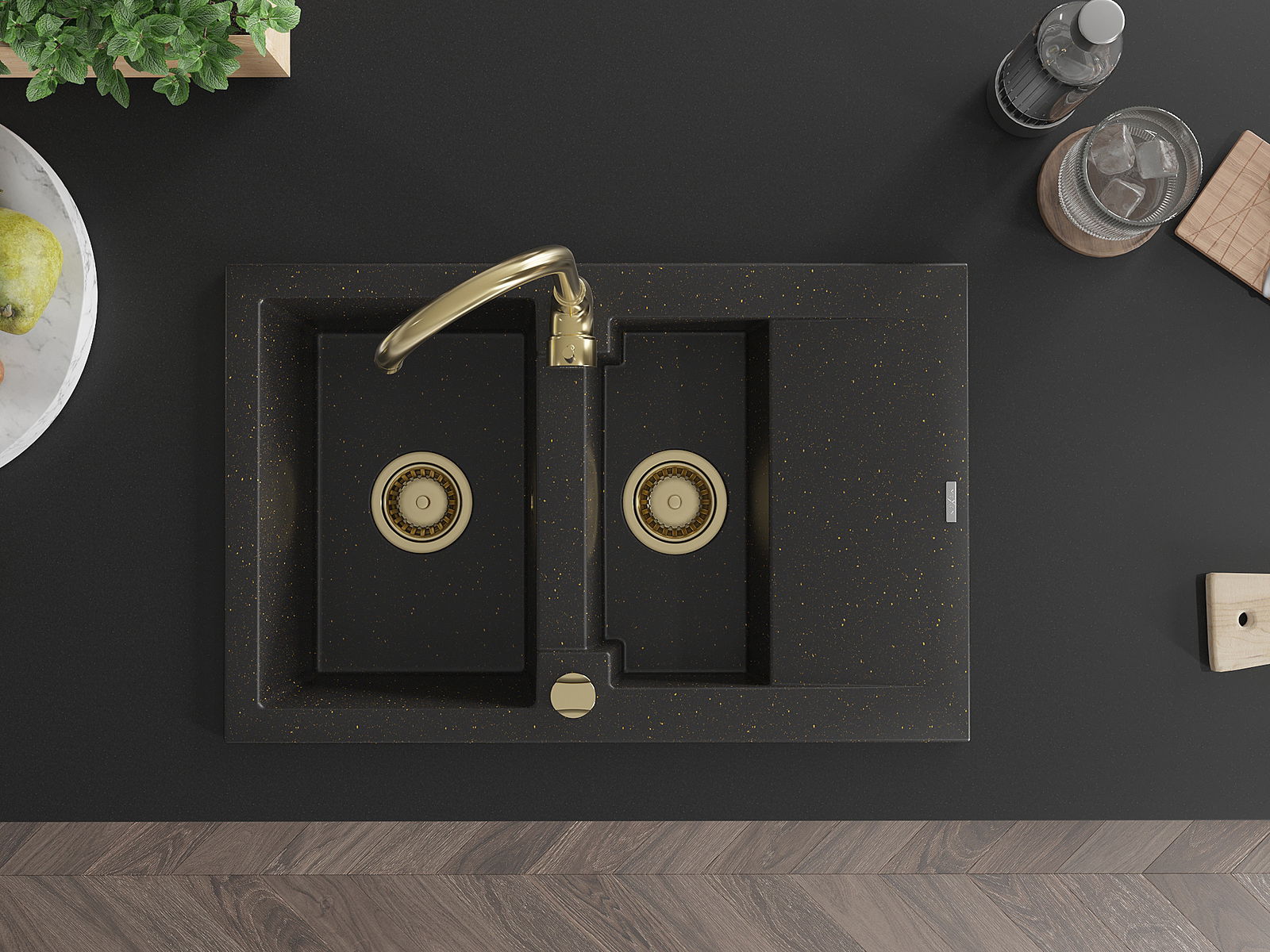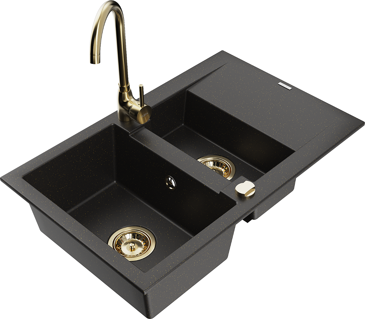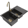 Mexen Gaspar granitový dřez 1,5-komorový s odkapávačem a kuchyňskou baterií Telma, černý/zlatý - 6507-75-670200-50