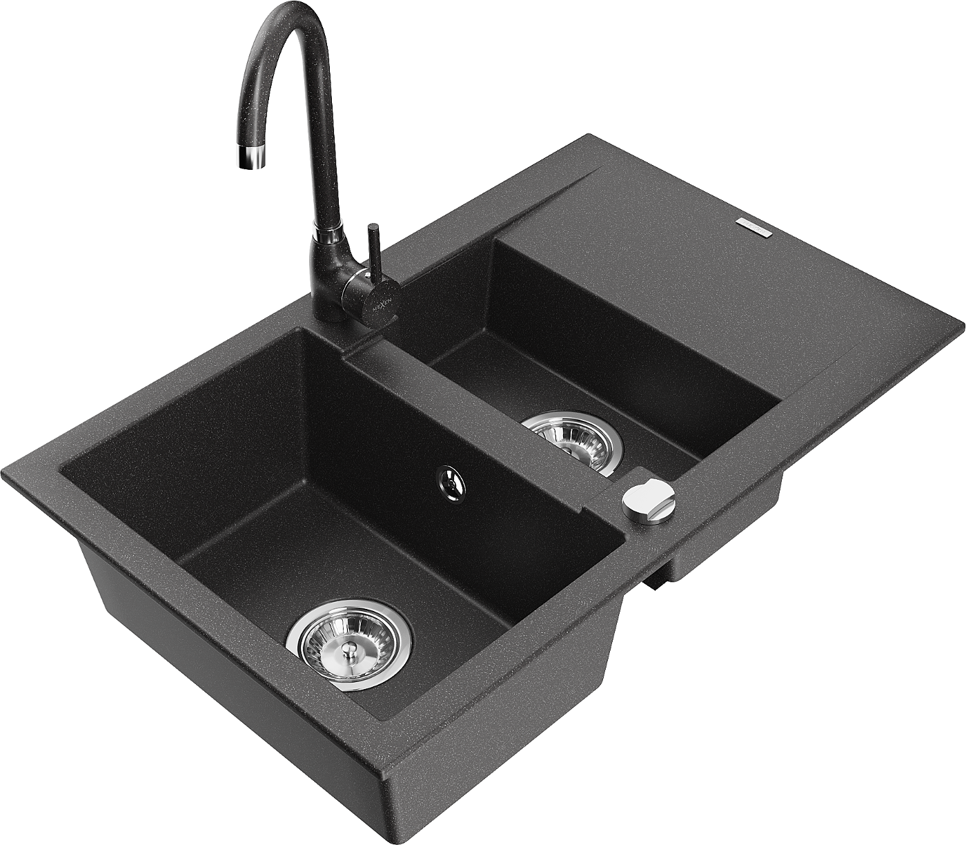 Mexen Gaspar dřez granitový 1,5-komorový s odkapem a kuchyňskou baterií Telma, černý kropenatý - 6507-76-670200-76