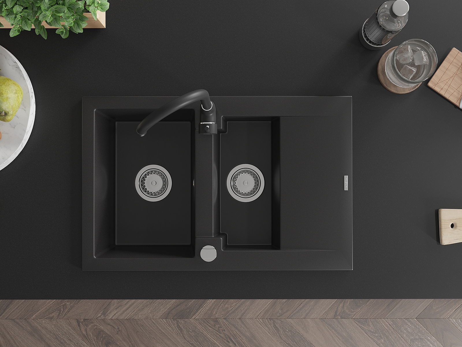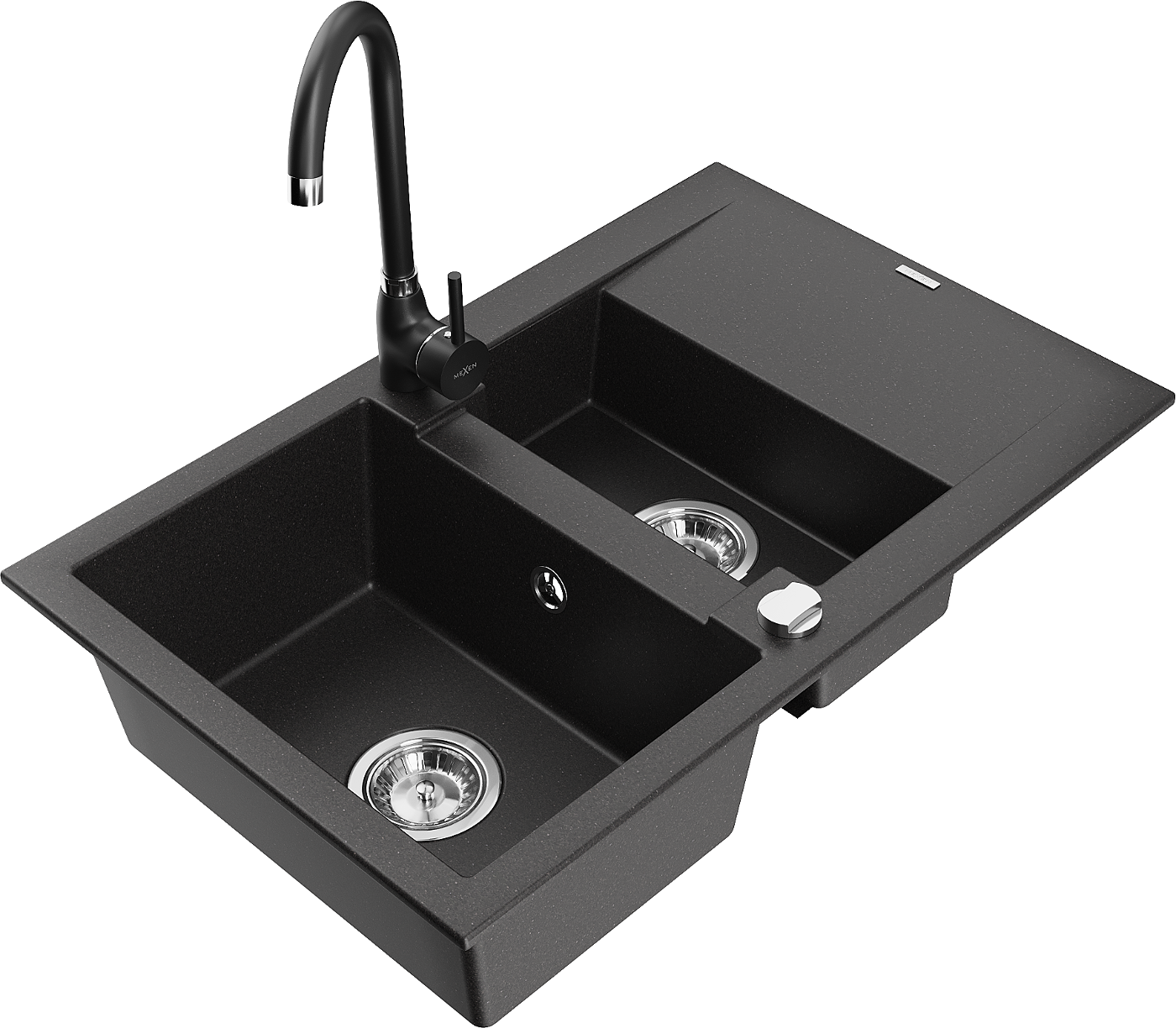 Mexen Gaspar kuchyňský dřez z granitu 1,5-komorový s odkapávačem a kuchyňská baterie Telma, černá - 6507-77-670200-70