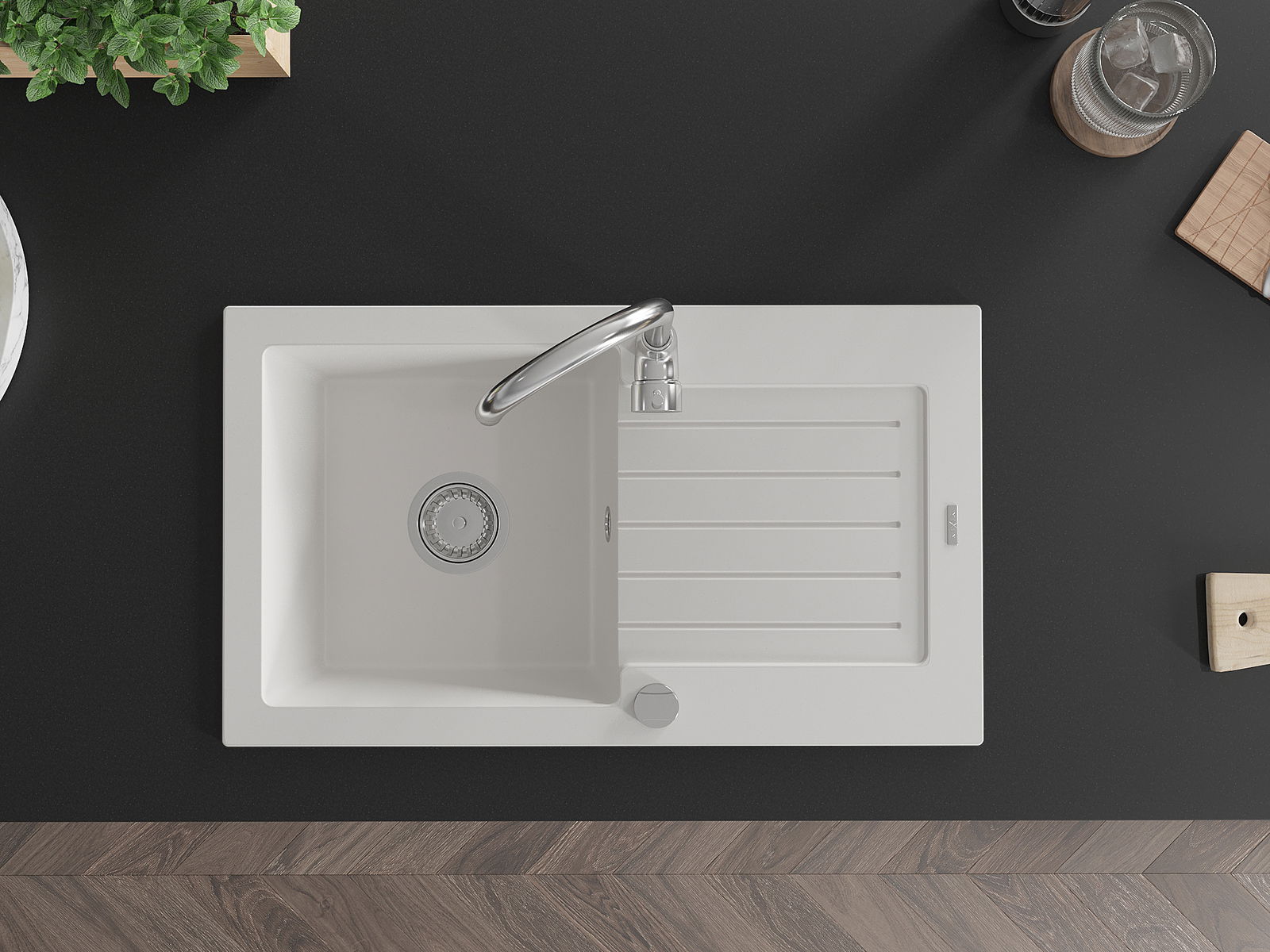 Mexen Pablo granitový dřez s 1 komorou, odkapávačem a kuchyňskou baterií Telma, bílý - 6510-20-670200-00