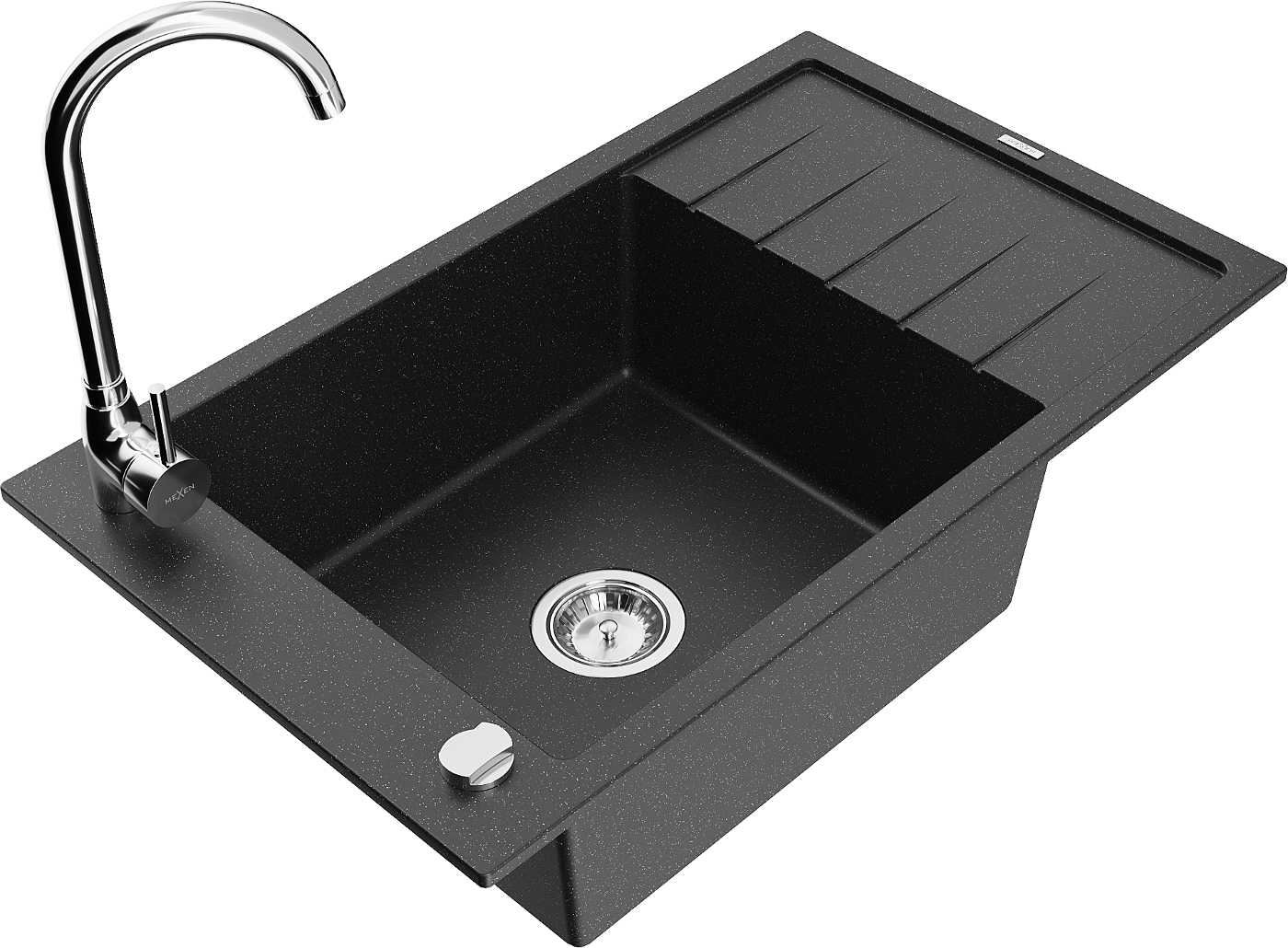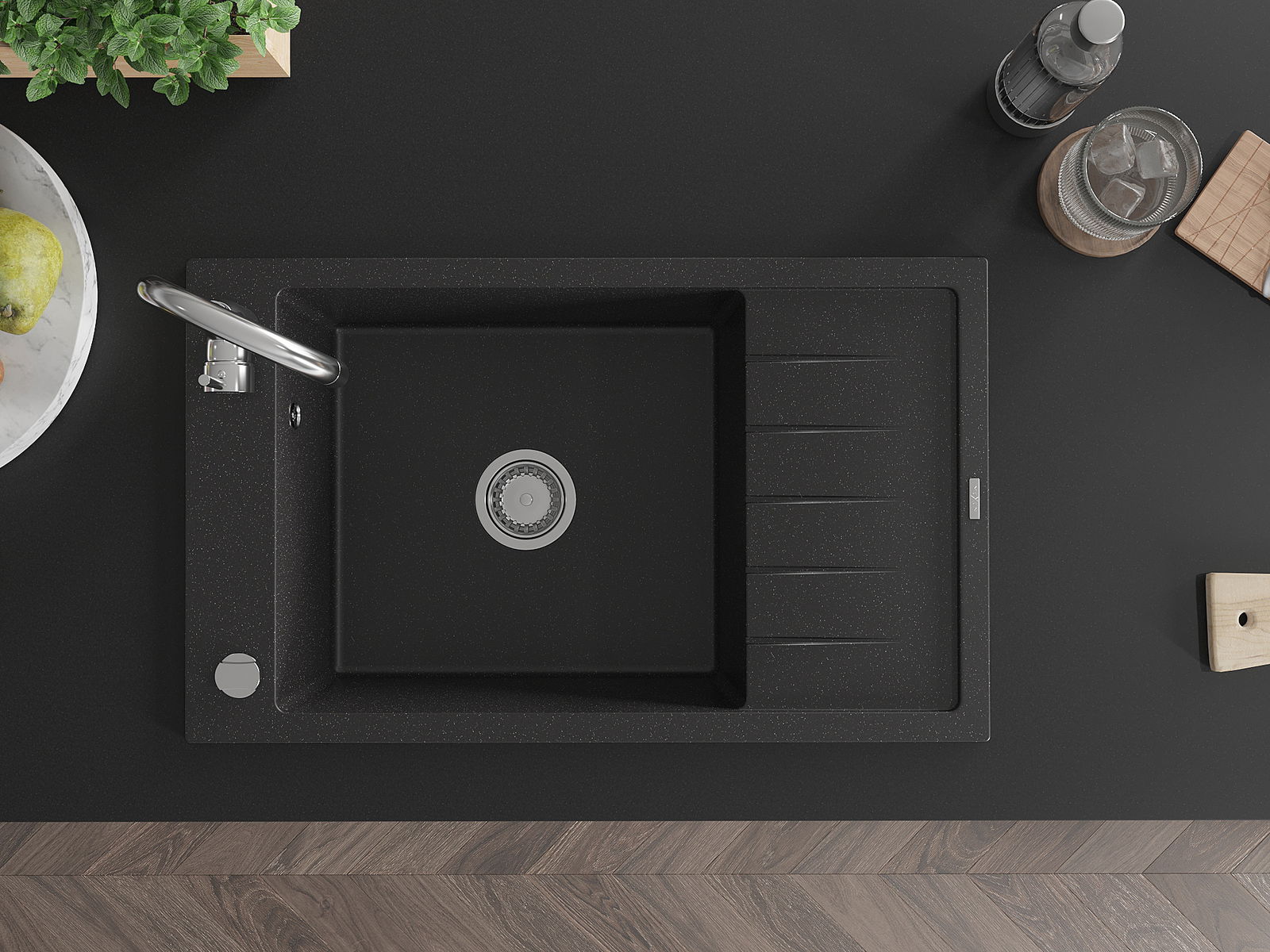 Mexen Elias granitový dřez 1-komorový s odkapávačem a kuchyňskou baterií Telma, černý/silber - 6511-73-670200-00