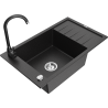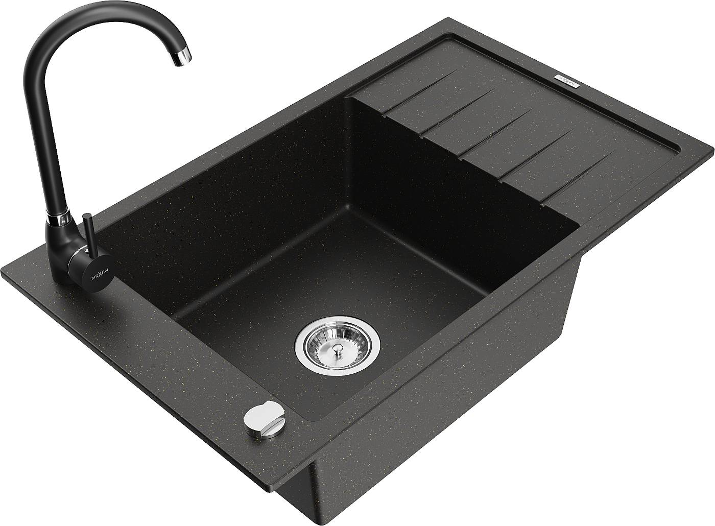 Mexen Elias granitový dřez 1-komorový s odkapávačem a kuchyňskou baterií Telma, černá/zlatá - 6511-75-670200-70