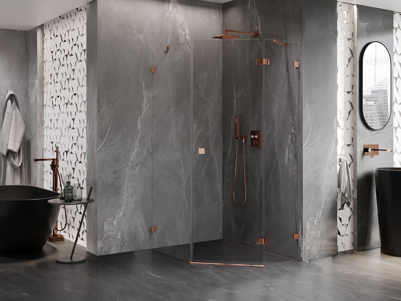 Mexen Lunar pětiúhelníkový sprchový kout otevírací pravý 90 x 100 cm, transparentní, růžové zlato - 831-090P-100L-60-00-P
