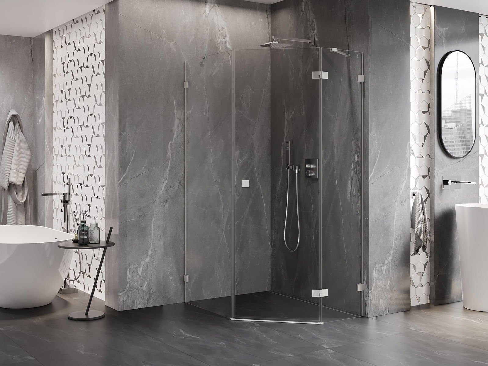 Praktická a pohodlná rukojeť je vyrobena z odolného a trvanlivého kovu. Moderní tvar ve spojení s povrchovou úpravou, která ladí s barvou profilů, dodává celku moderní a stylový vzhled, zdůrazňující estetiku každé koupelny.