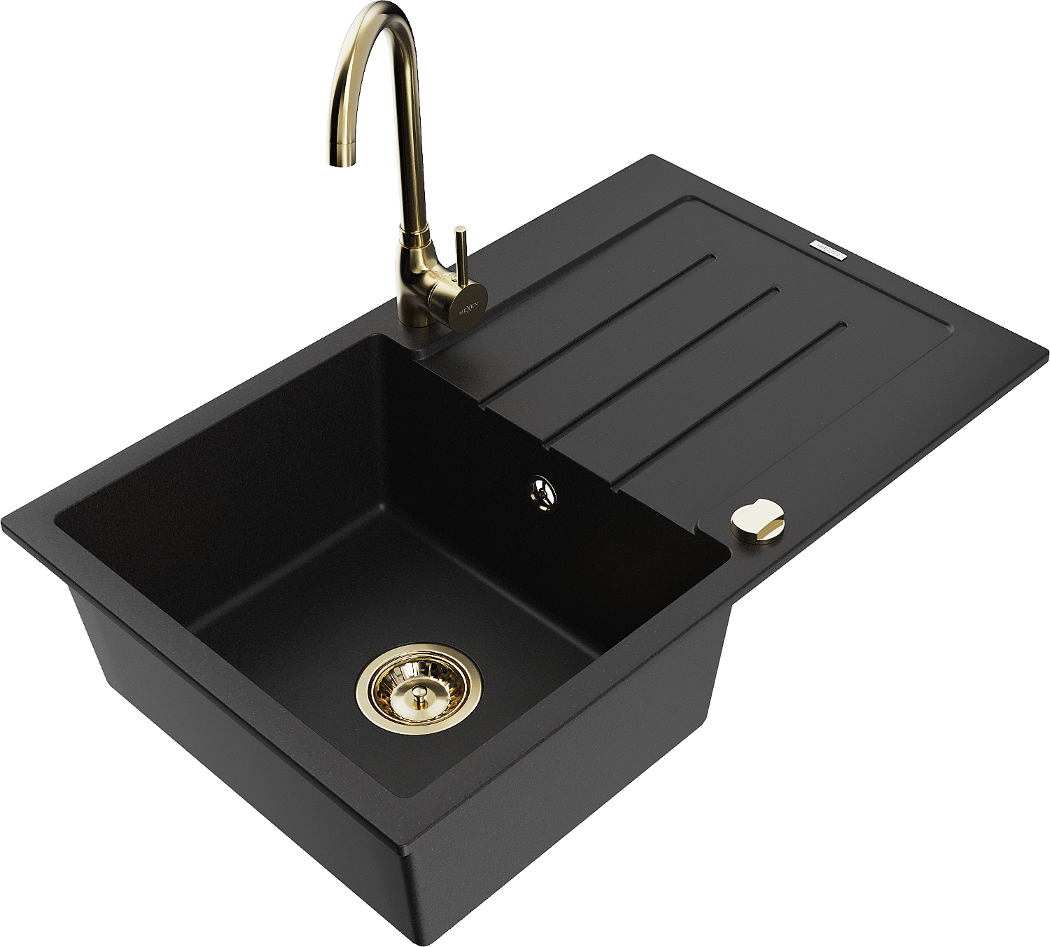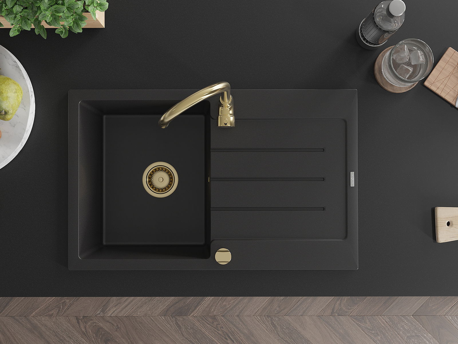 Mexen Bruno žulový dřez s 1 komorou, odkapávačem a kuchyňskou baterií Telma, černý - 6513-77-670200-50