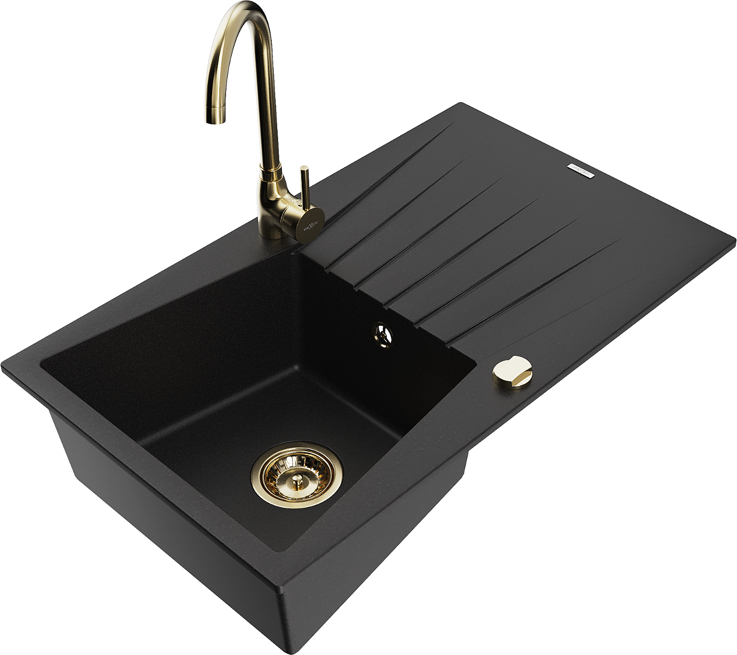 Mexen Cesar žulový dřez 1-komorový s odkapávačem a kuchyňskou baterií Telma, černý - 6514-77-670200-50