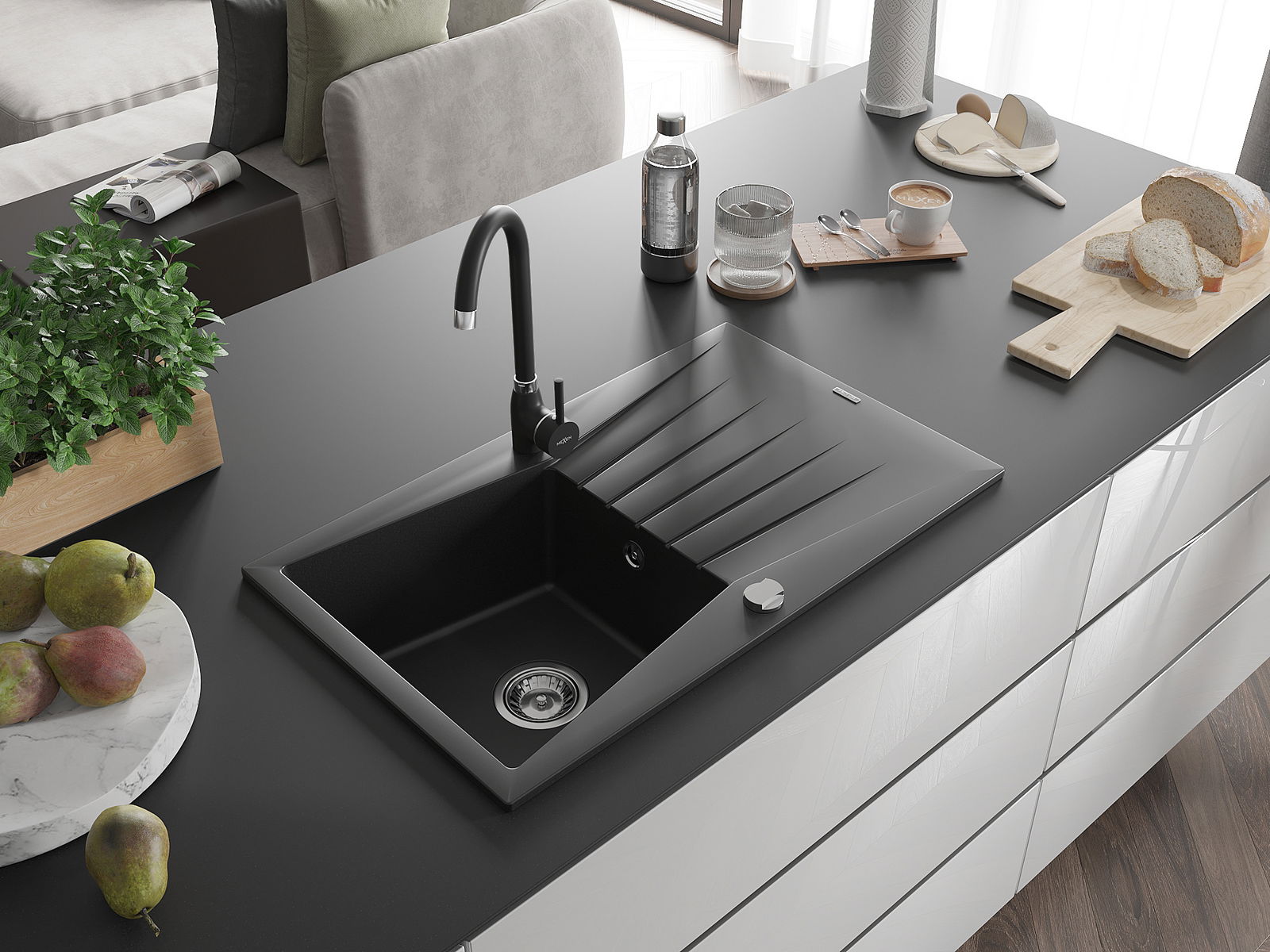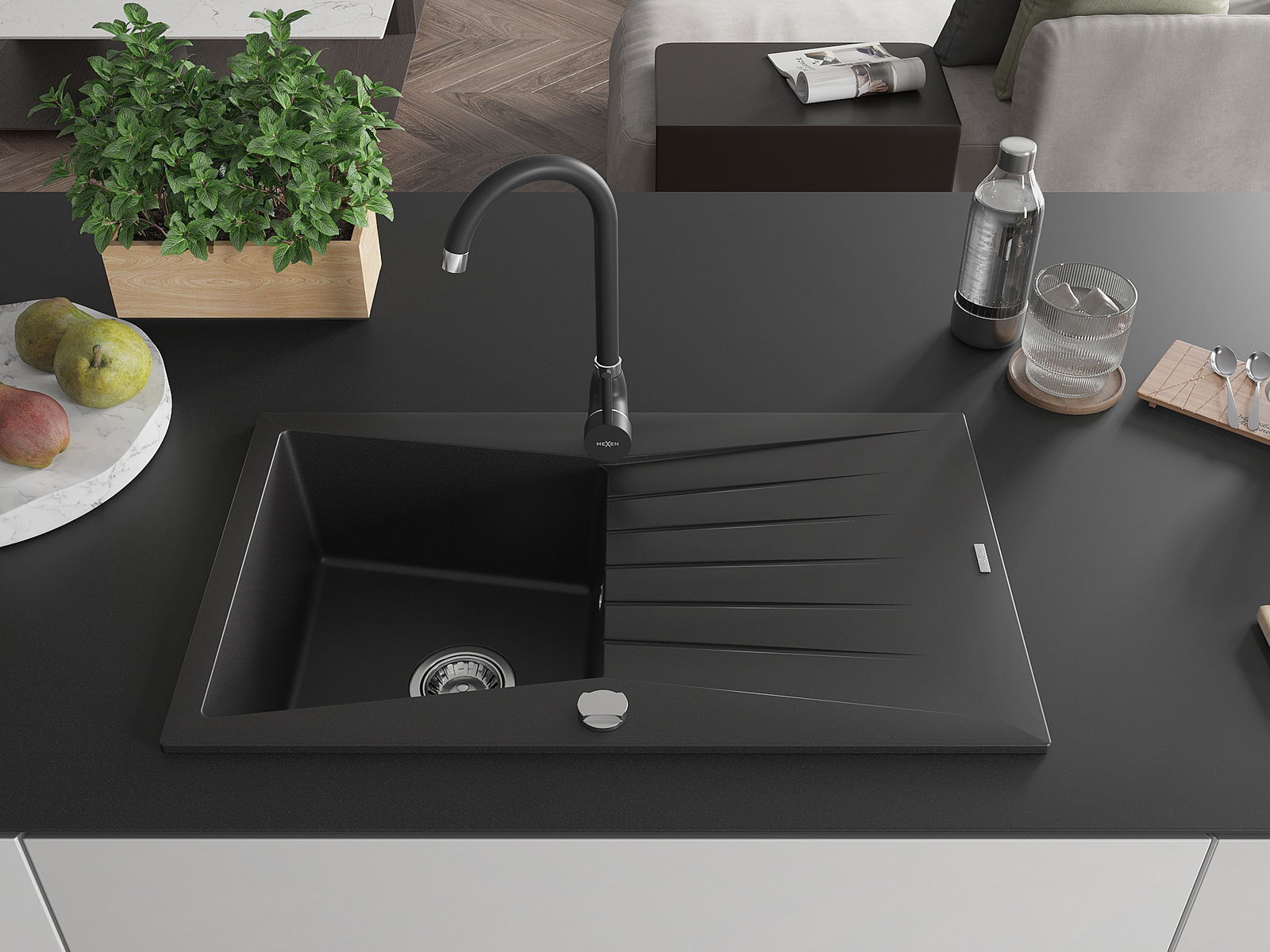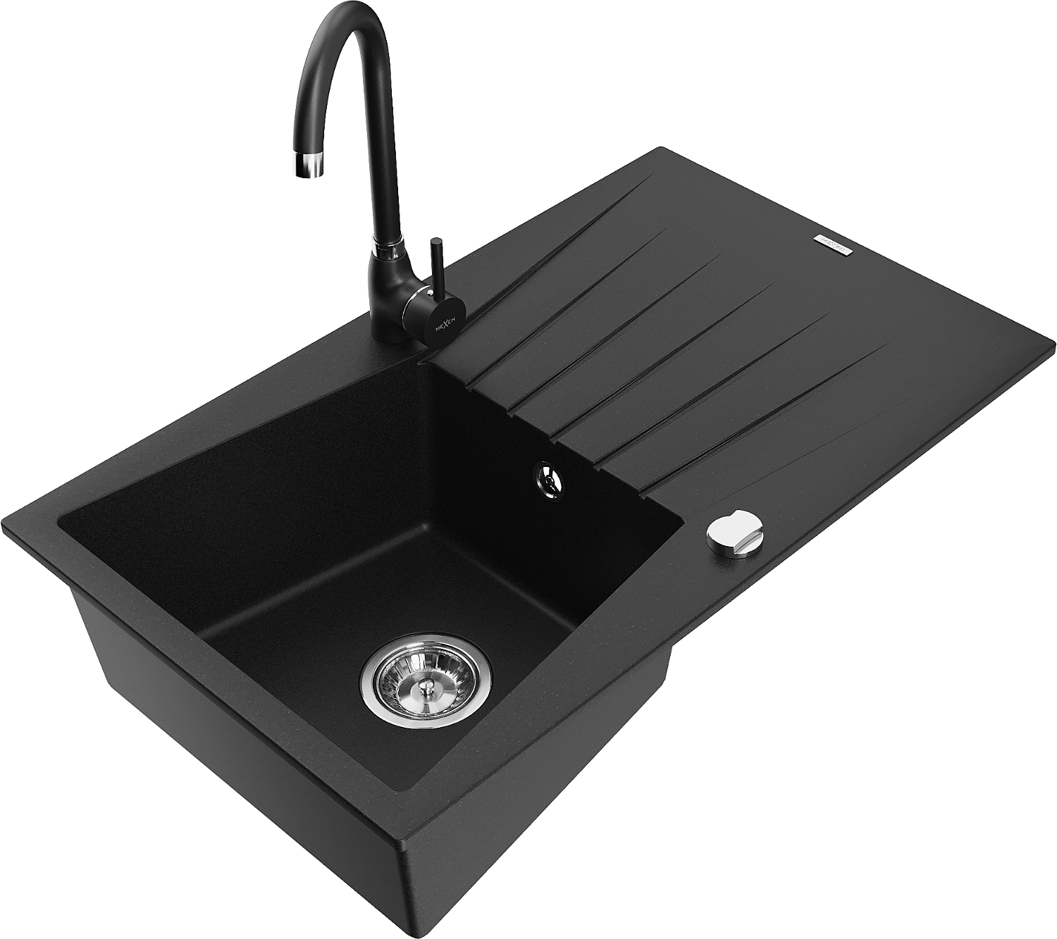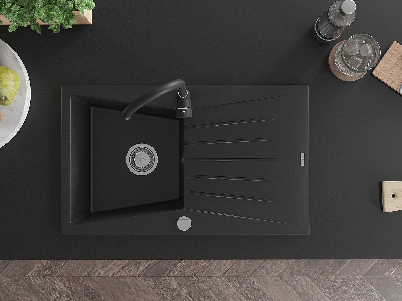Mexen Cesar granitový dřez 1-komorový s odkapávačem a kuchyňskou baterií Telma, černý - 6514-77-670200-70