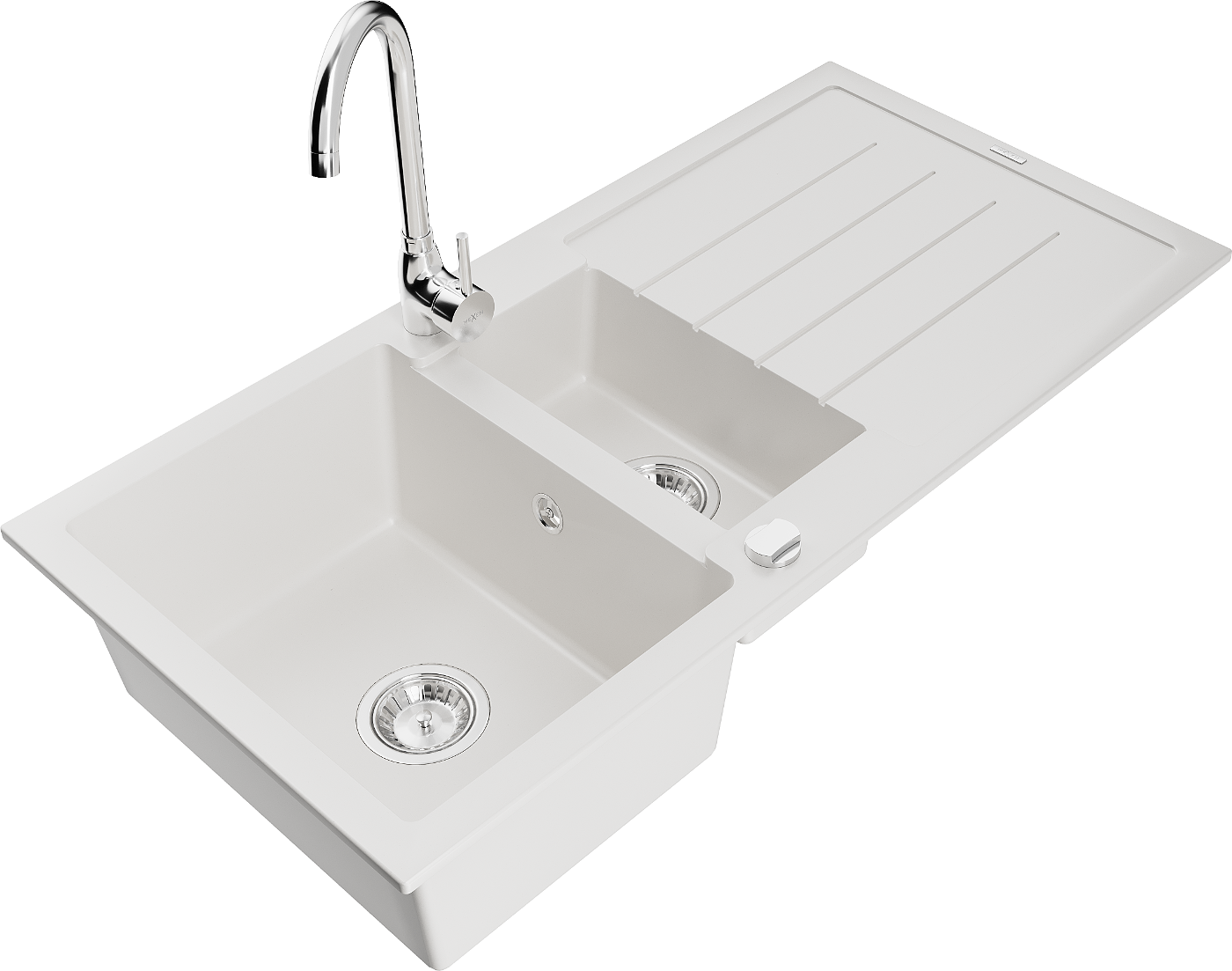 Mexen Andres granitový dřez 1,5-komorový s odkapávačem a kuchyňskou baterií Telma, bílý - 6515-20-670200-00