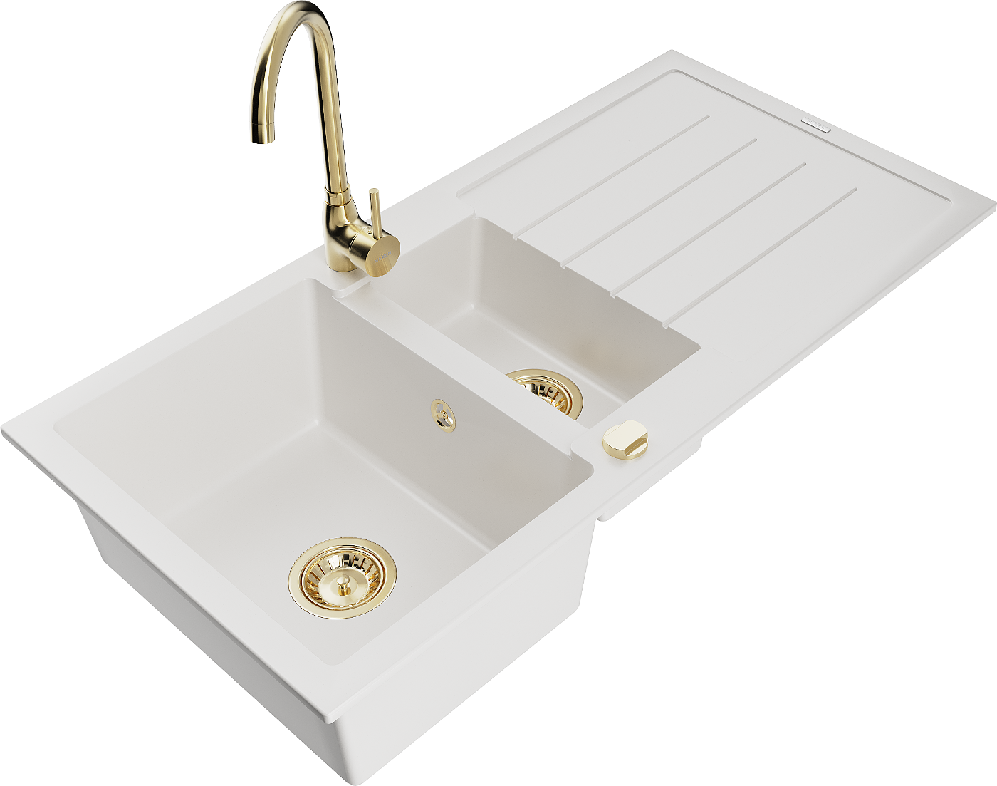 Mexen Andres žulový dřez 1,5-komorový s odkapávačem a kuchyňskou baterií Telma, bílý - 6515-20-670200-50