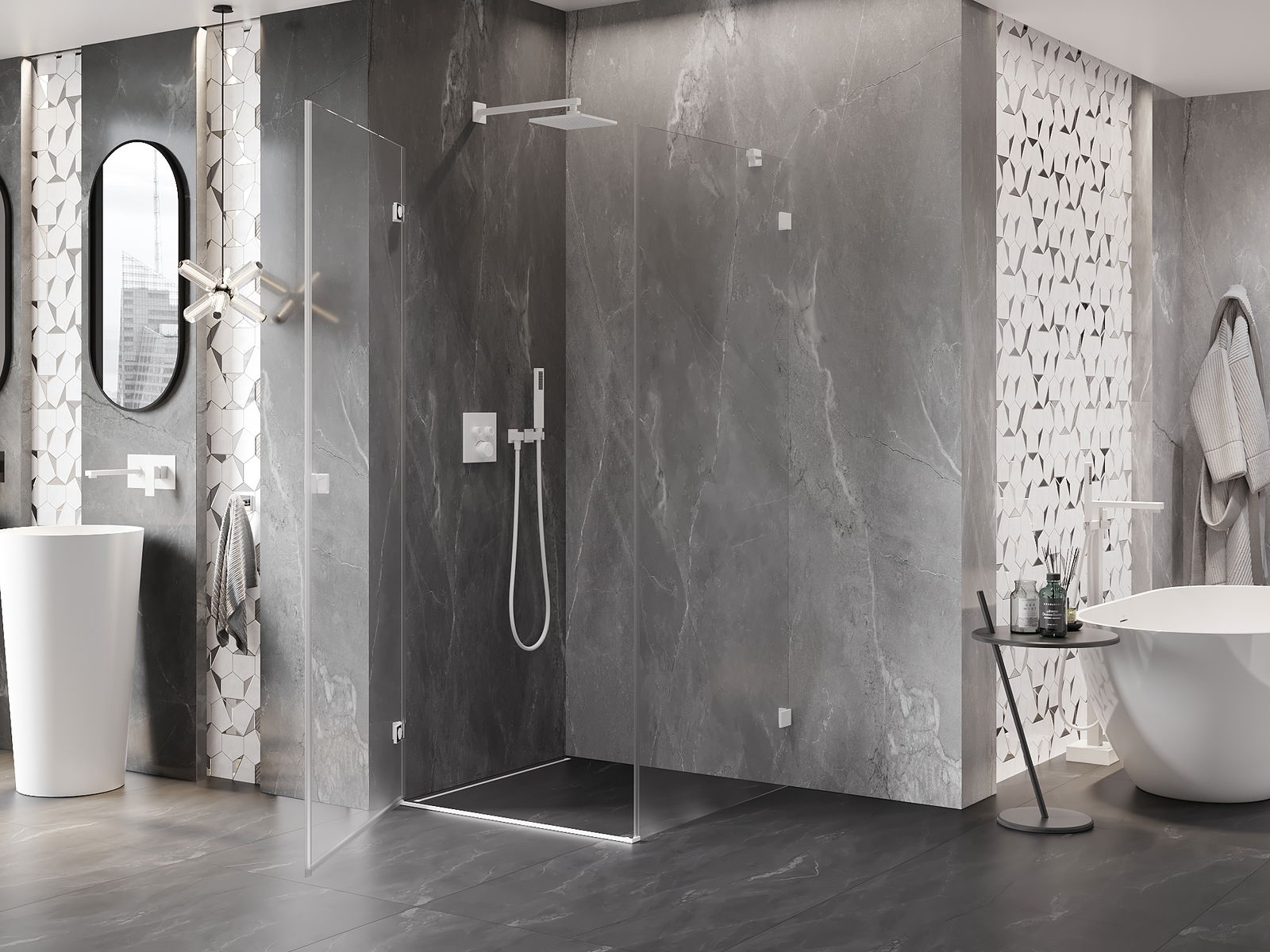 Praktická a pohodlná rukojeť je vyrobena z odolného a trvanlivého kovu. Moderní tvar ve spojení s povrchovou úpravou, která ladí s barvou profilů, dodává celku moderní a stylový vzhled, zdůrazňující estetiku každé koupelny.