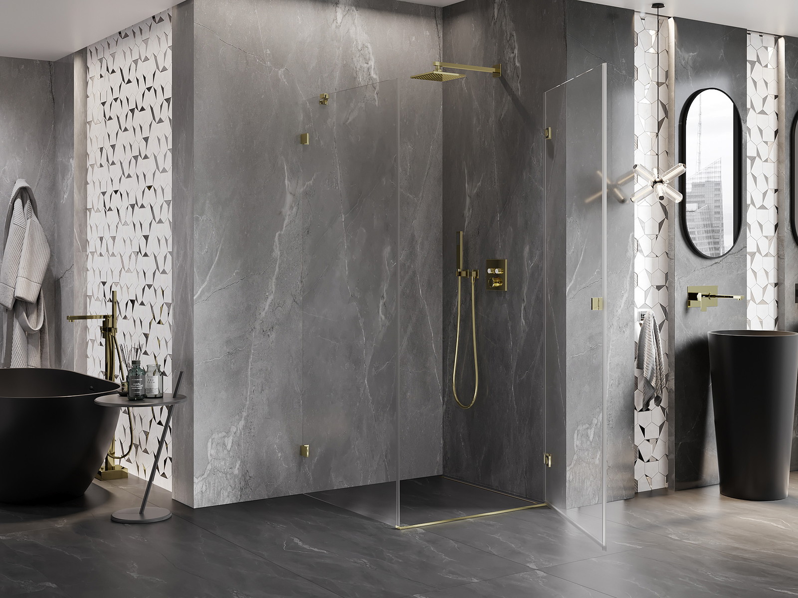 Mexen Lunar-B sprchový kout nabízí moderní design a funkčnost. Velikost 90x90 cm a výška 200 cm zajišťují pohodlí při používání. Otevírací dveře, transparentní kalené sklo o tloušťce 6 mm (dveře) a 8 mm (stěna) s povlakem usnadňujícím čištění. Zlatá povrchová úprava a hliníkový profil dodávají eleganci. Kout disponuje mechanismem zvedání dveří, magnetickými těsněními a mosaznými zarážkami. Nastavení šířky a možnost montáže zajišťují univerzálnost použití.