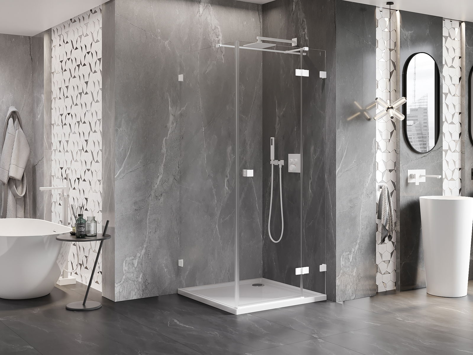 Praktická a pohodlná rukojeť je vyrobena z odolného a trvanlivého kovu. Moderní tvar ve spojení s povrchovou úpravou, která ladí s barvou profilů, dodává celku moderní a stylový vzhled, zdůrazňující estetiku každé koupelny.