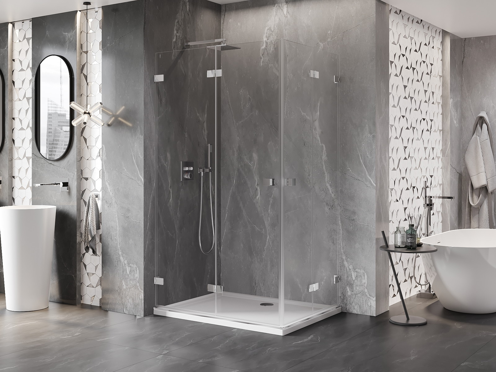 Možnost skládání dveří, jak dovnitř, tak ven, umožňuje získat více prostoru při nepoužívání sprchy. Je to ideální řešení pro menší koupelny, maximálně využívající dostupný prostor.
