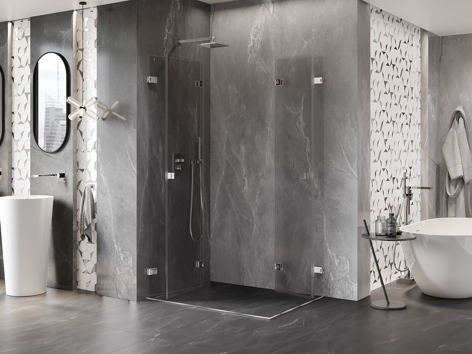 Možnost skládání dveří, jak dovnitř, tak ven, umožňuje získat více prostoru při nepoužívání sprchy. Je to ideální řešení pro menší koupelny, maximálně využívající dostupný prostor.