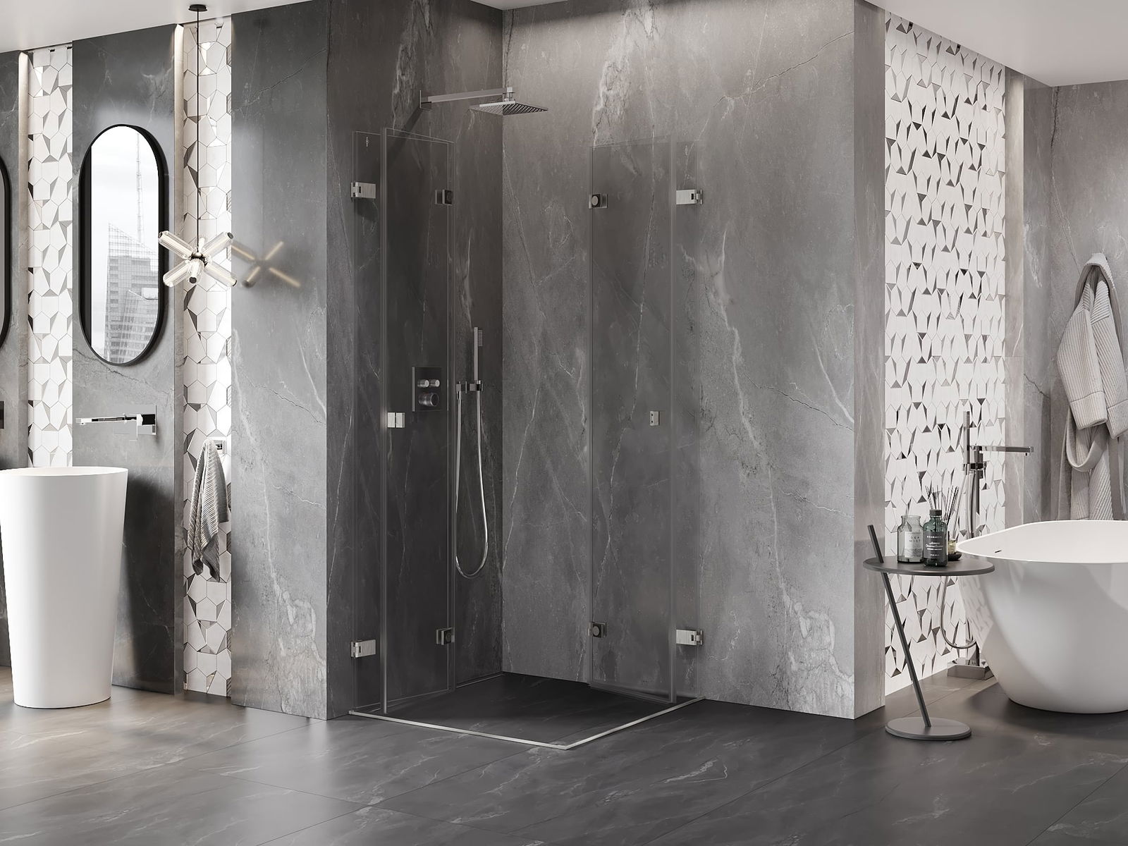 Možnost skládání dveří, jak dovnitř, tak ven, umožňuje získat více prostoru při nepoužívání sprchy. Je to ideální řešení pro menší koupelny, maximálně využívající dostupný prostor.