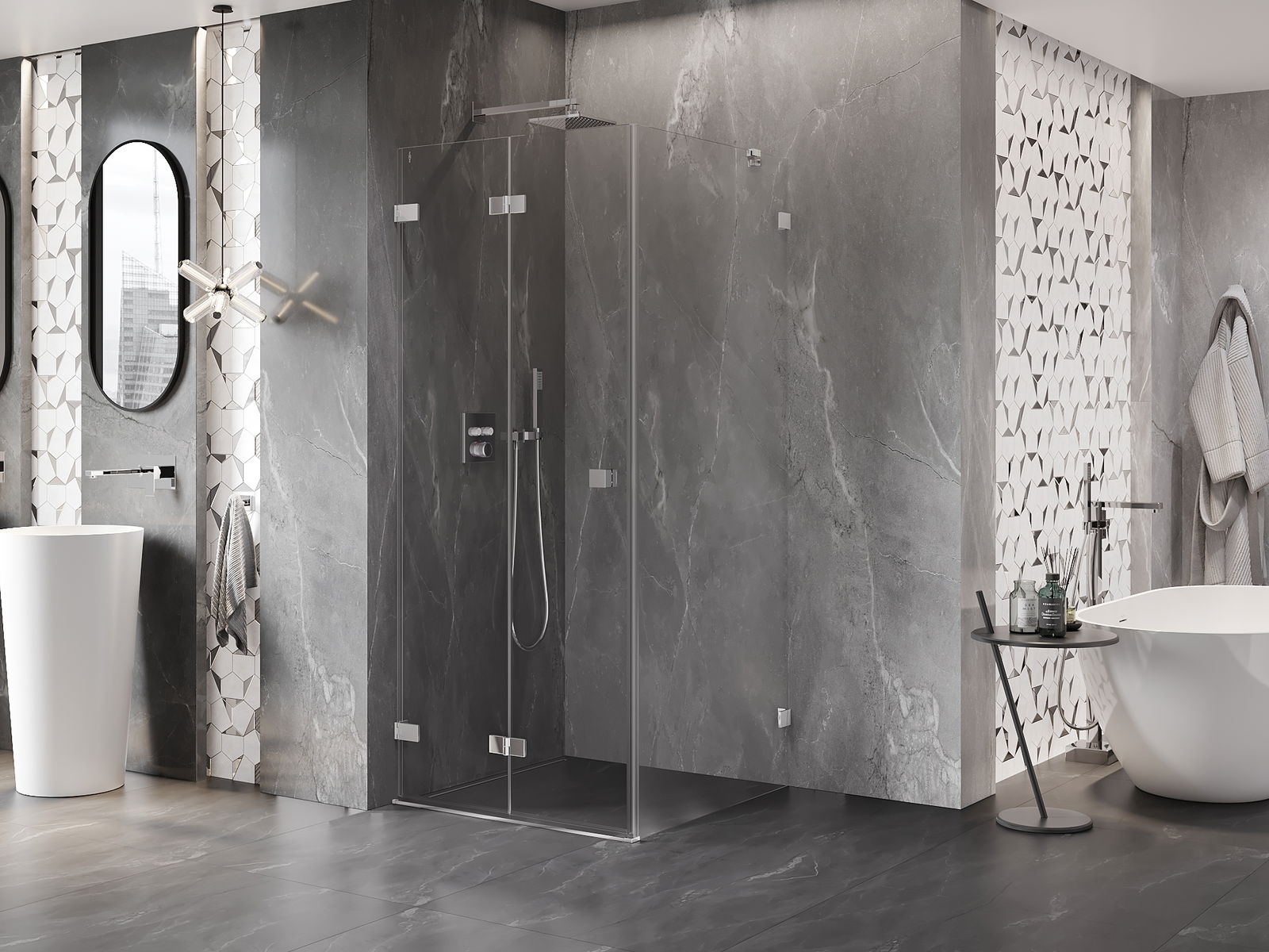Možnost skládání dveří, jak dovnitř, tak ven, umožňuje získat více prostoru při nepoužívání sprchy. Je to ideální řešení pro menší koupelny, maximálně využívající dostupný prostor.