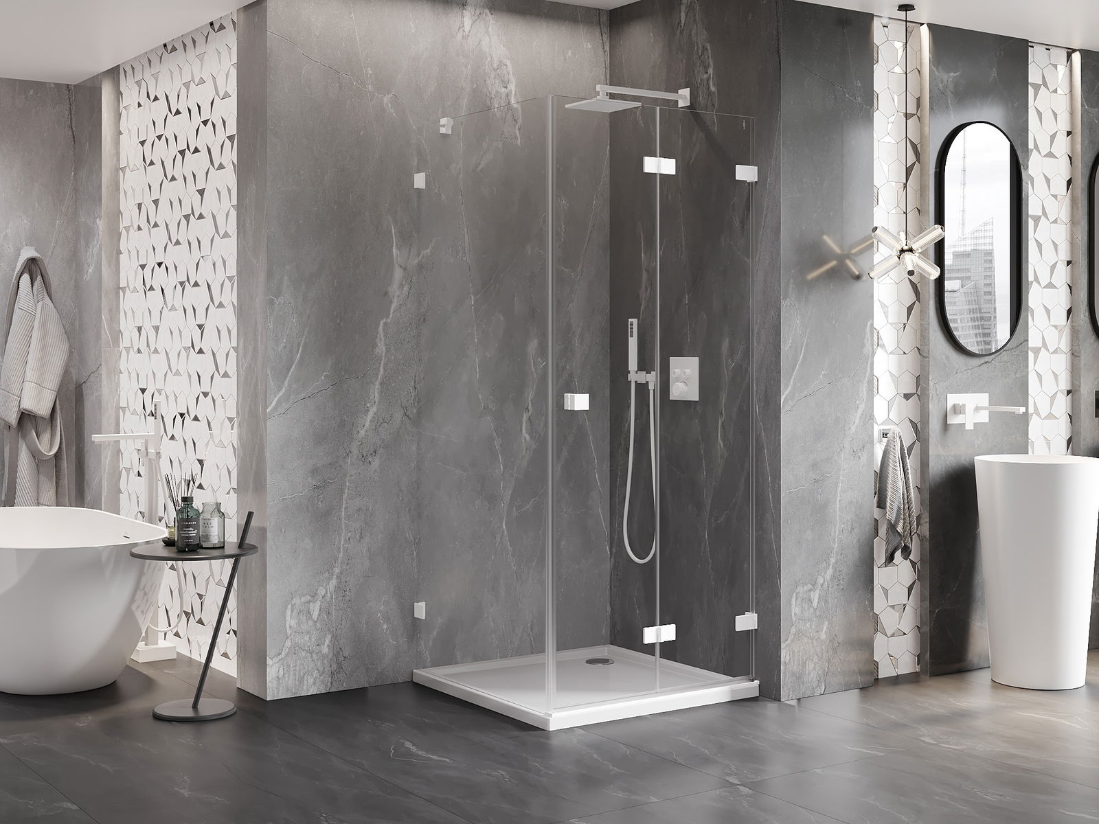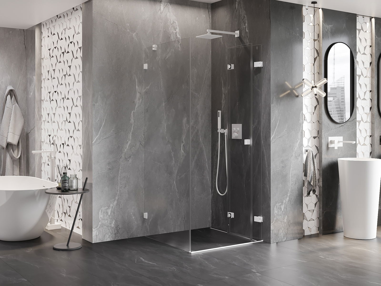Možnost skládání dveří, jak dovnitř, tak ven, umožňuje získat více prostoru při nepoužívání sprchy. Je to ideální řešení pro menší koupelny, maximálně využívající dostupný prostor.