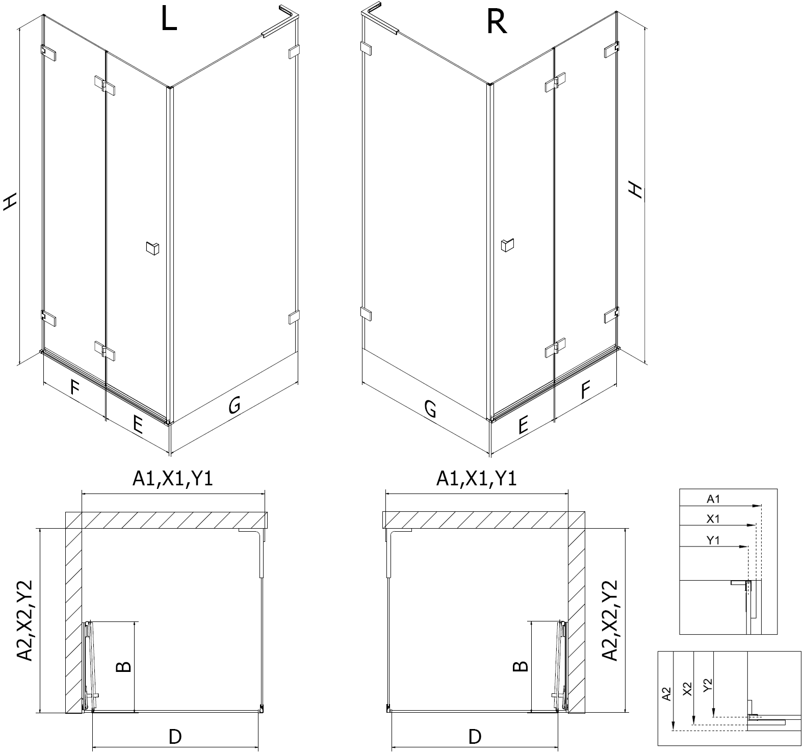 Velikost: 90x80 cm (levé dveře 90 cm, stěna 80 cm)