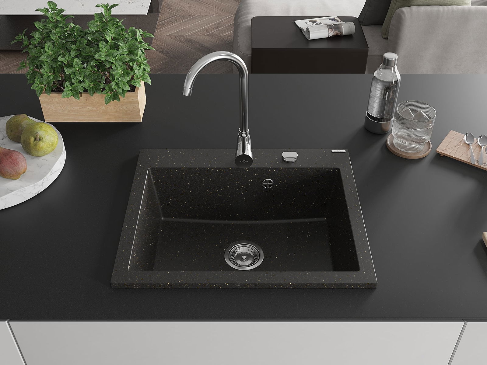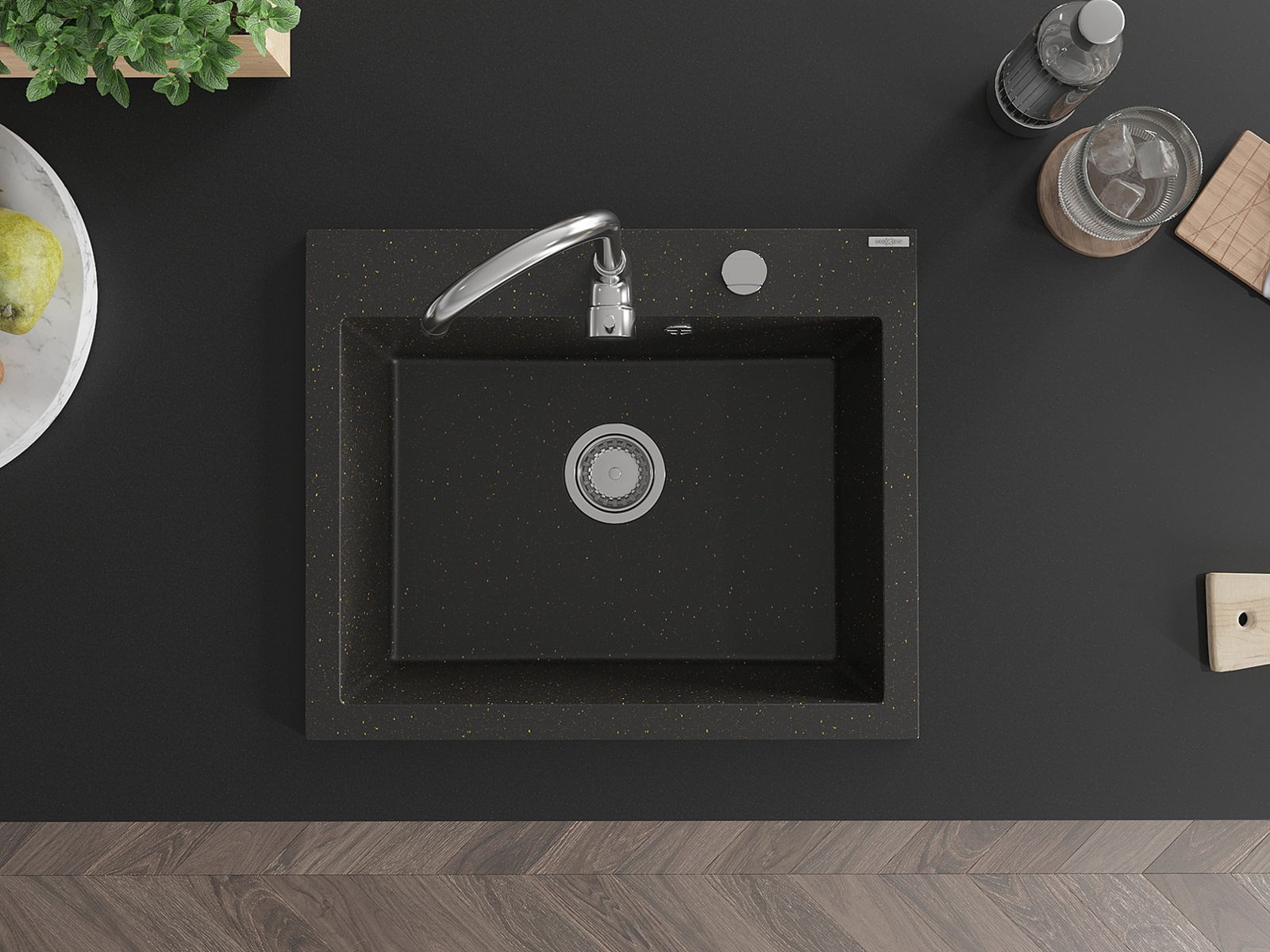 Mexen Elix granitový dřez s jednou komorou 600 x 500 mm, černý/zlatý metalický, sifon chrom - 6525601005-75