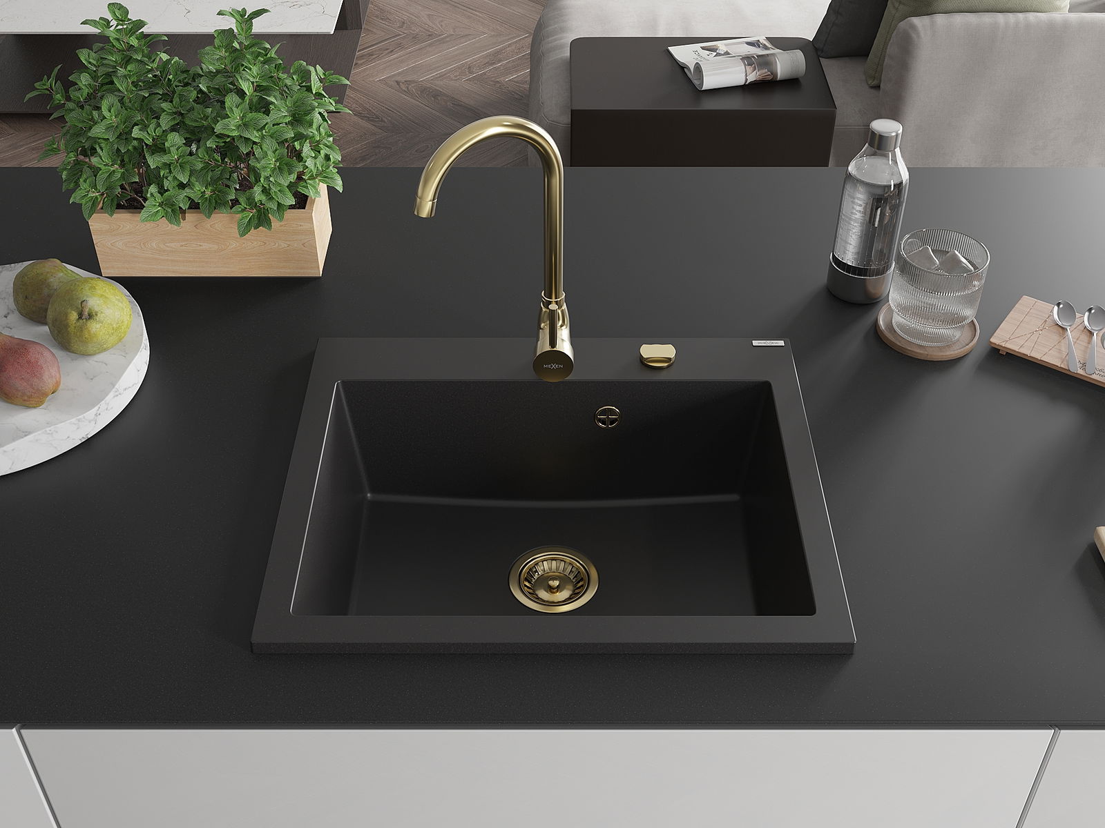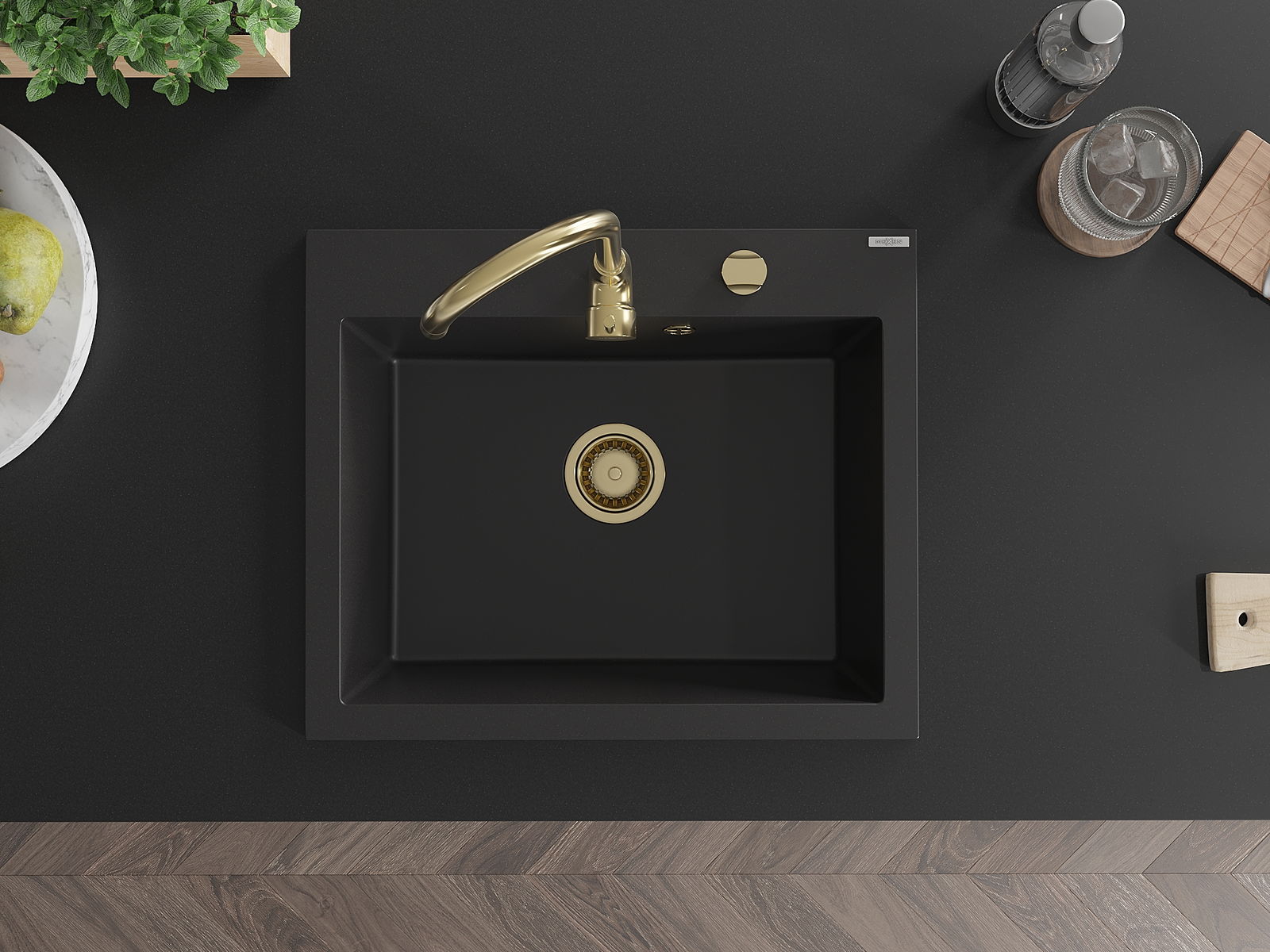 Mexen Elix granitový dřez s 1 komorou 600 x 500 mm, černý, sifon zlatý - 6525601005-77-G