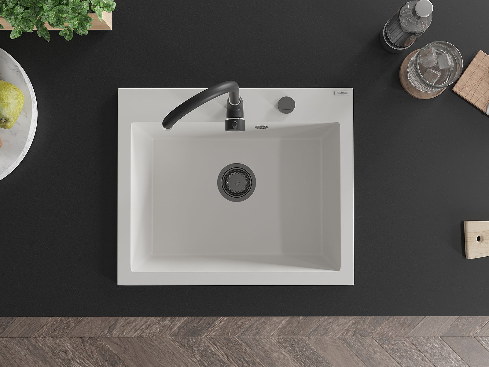 Mexen Elix granitový dřez, jednokomorový, 600 x 500 mm, bílý, černý sifon - 6525601005-20-B