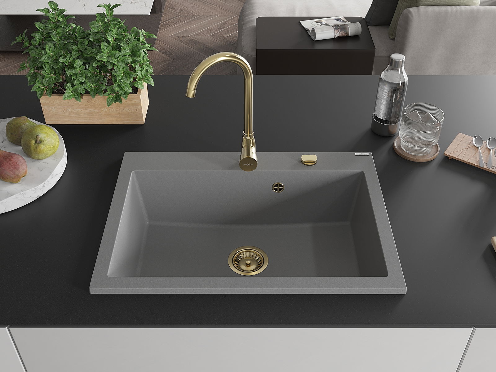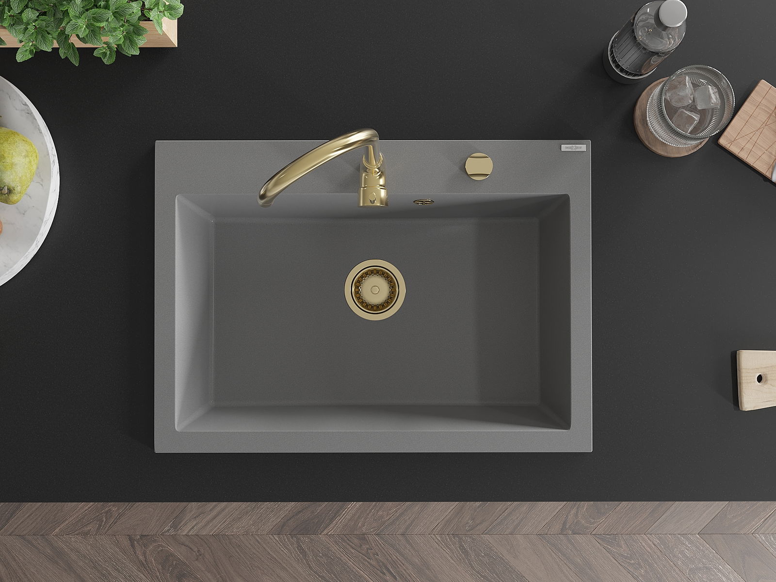 Mexen Elix granitový dřez 1-komorový 700 x 500 mm, šedý, sifon zlatý - 6526701005-71-G