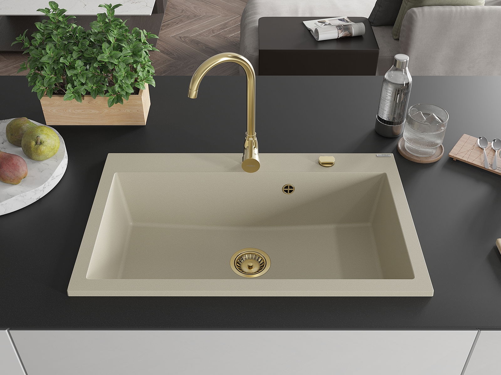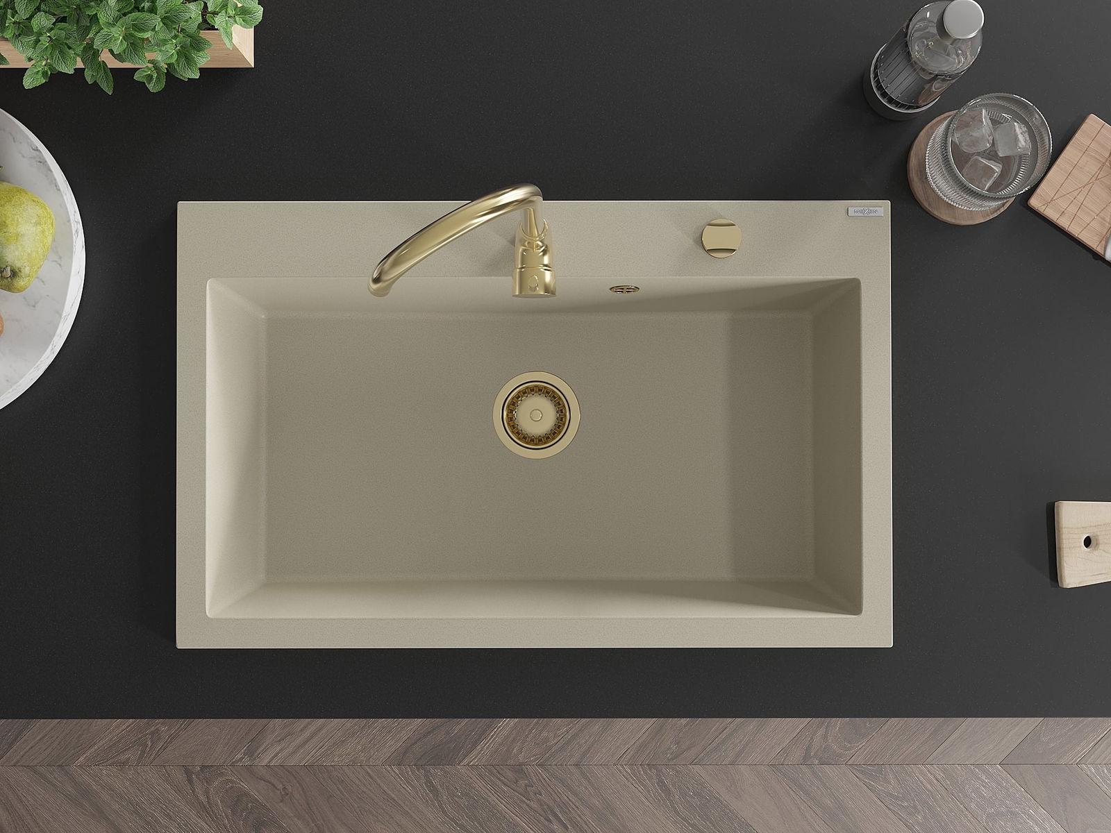 Mexen Elix granitový dřez 1-komorový 800 x 500 mm, béžový, zlatý sifon - 6527801005-69-G
