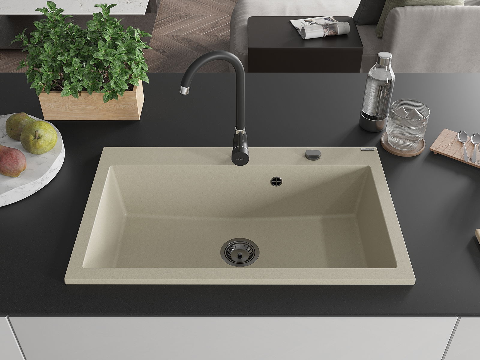 Mexen Elix granitový dřez s 1 komorou 800 x 500 mm, béžový, černý sifon - 6527801005-69-B
