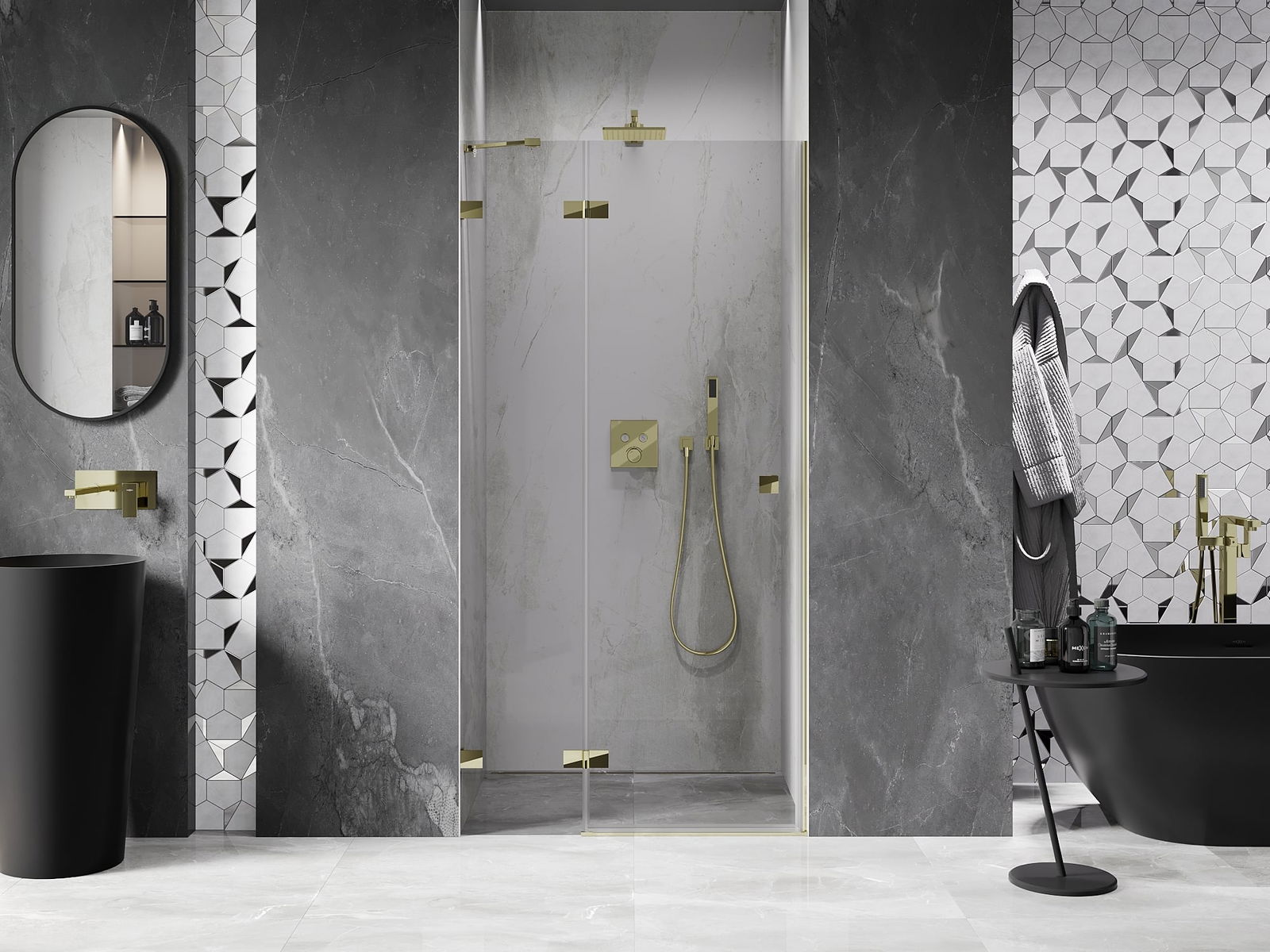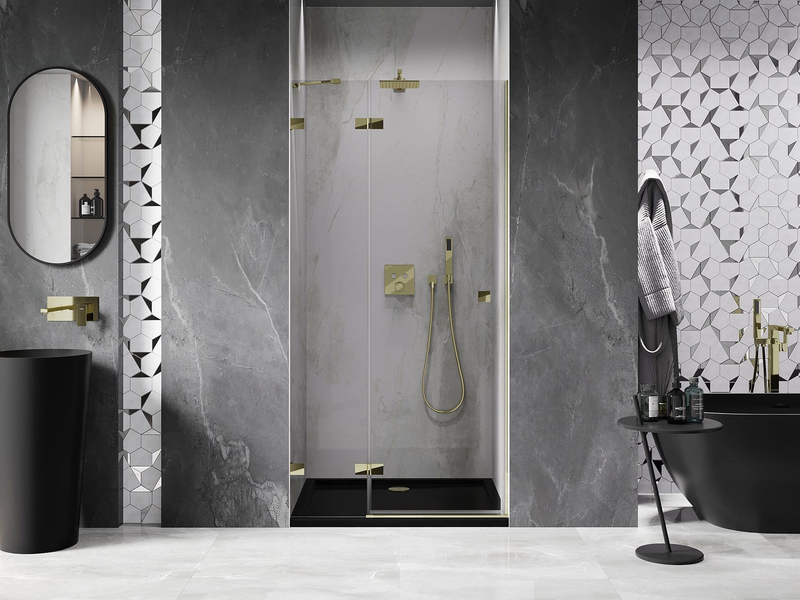 Spony a závěsy byly vyrobeny z velmi odolné mosazi a navíc vytvářejí zarovnanou plochu skla. Je to vynikající volba, která kombinuje eleganci, odolnost a moderní design. Díky těmto řešením získává sprcha na estetice a zároveň usnadňuje udržování čistoty.