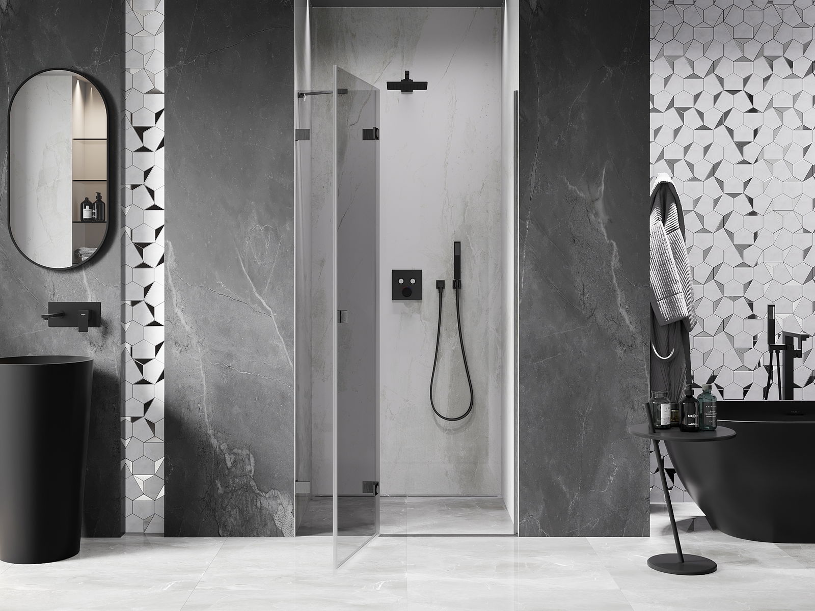 Praktická a pohodlná rukojeť je vyrobena z odolného a trvanlivého kovu. Moderní tvar ve spojení s povrchovou úpravou, která ladí s barvou profilů, dodává celku moderní a stylový vzhled, zdůrazňující estetiku každé koupelny.