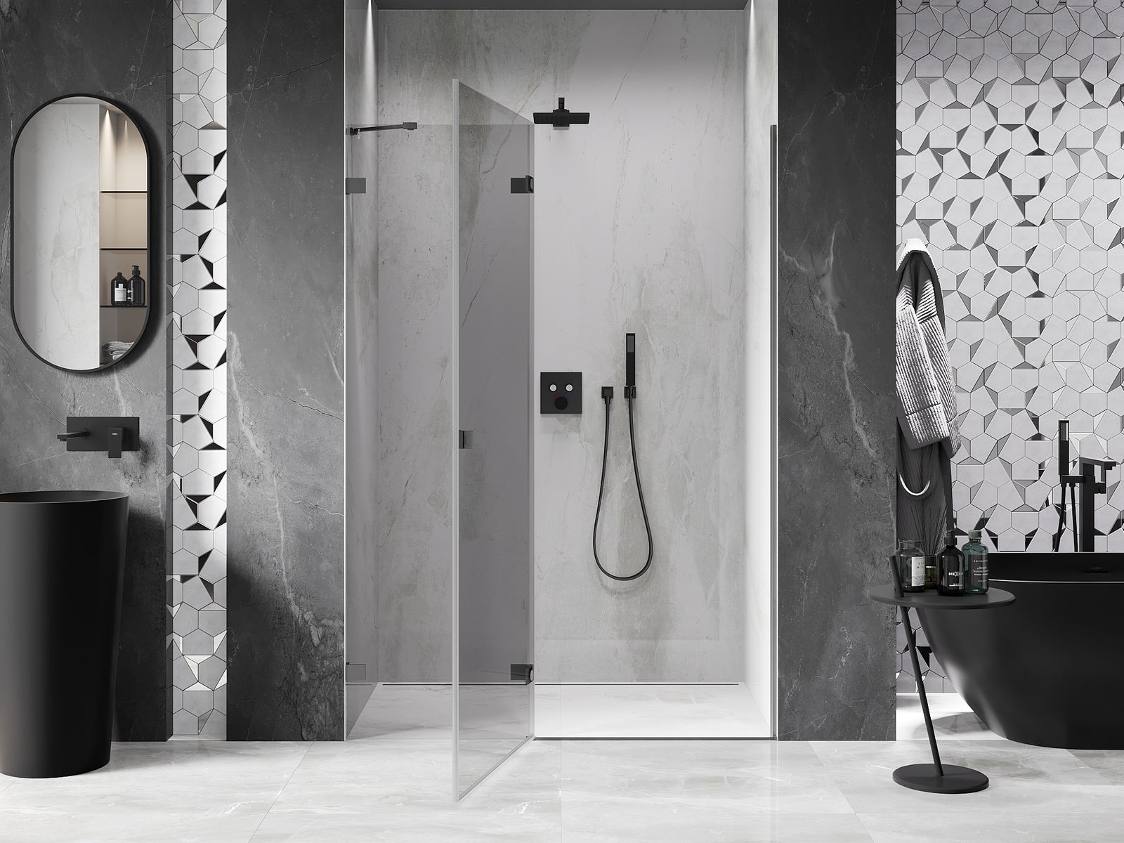 Praktická a pohodlná rukojeť je vyrobena z odolného a trvanlivého kovu. Moderní tvar ve spojení s povrchovou úpravou, která ladí s barvou profilů, dodává celku moderní a stylový vzhled, zdůrazňující estetiku každé koupelny.
