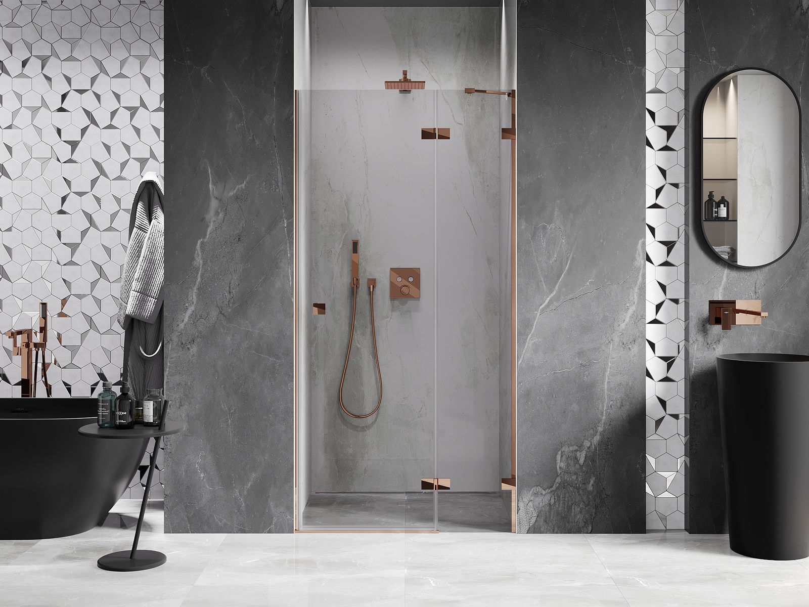 Spony a závěsy byly vyrobeny z velmi odolné mosazi a navíc vytvářejí zarovnanou plochu skla. Je to vynikající volba, která kombinuje eleganci, odolnost a moderní design. Díky těmto řešením získává sprcha na estetice a zároveň usnadňuje udržování čistoty.