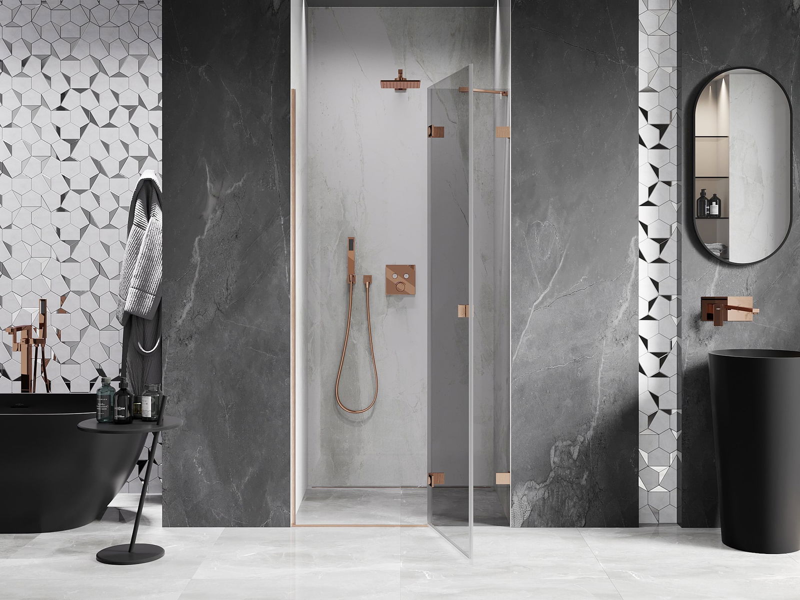 Spony a závěsy byly vyrobeny z velmi odolné mosazi a navíc vytvářejí zarovnanou plochu skla. Je to vynikající volba, která kombinuje eleganci, odolnost a moderní design. Díky těmto řešením získává sprcha na estetice a zároveň usnadňuje udržování čistoty.
