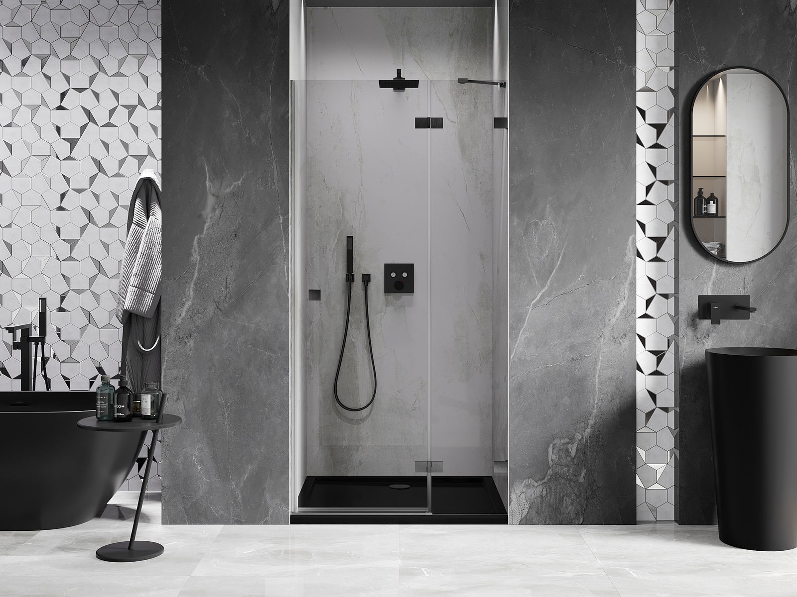 Praktická a pohodlná rukojeť je vyrobena z odolného a trvanlivého kovu. Moderní tvar ve spojení s povrchovou úpravou, která ladí s barvou profilů, dodává celku moderní a stylový vzhled, zdůrazňující estetiku každé koupelny.