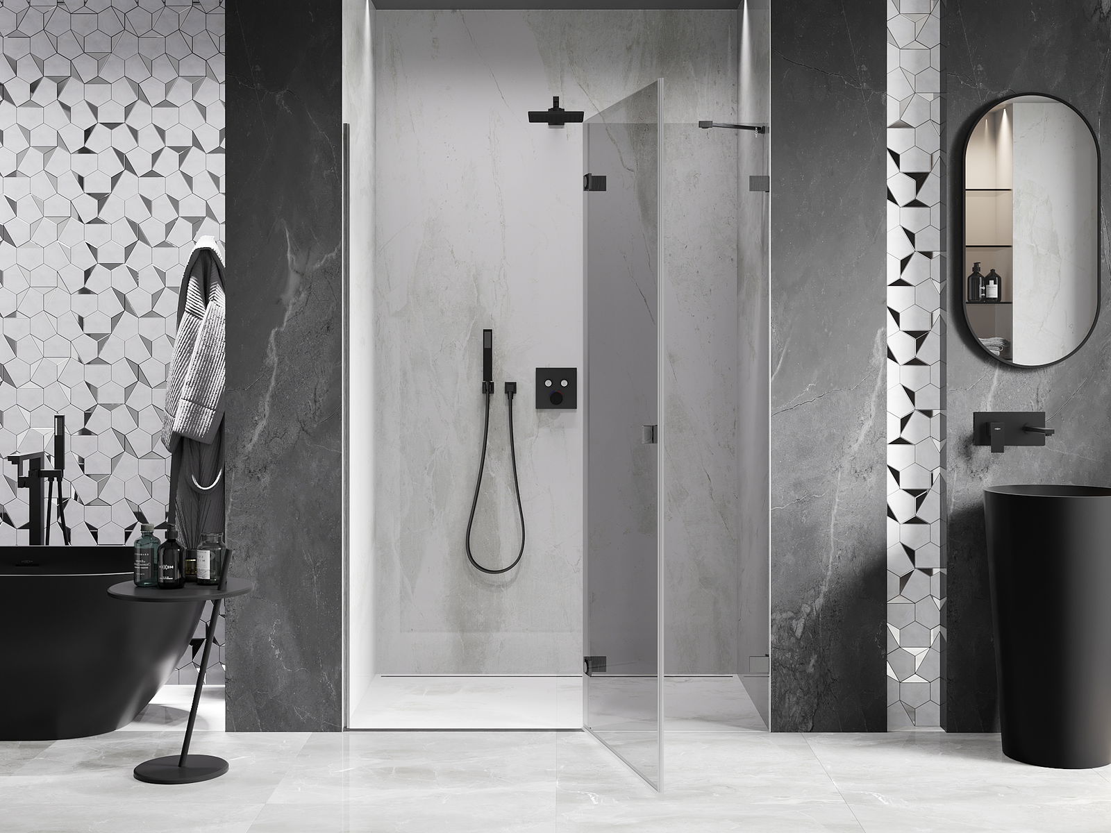 Praktická a pohodlná rukojeť je vyrobena z odolného a trvanlivého kovu. Moderní tvar ve spojení s povrchovou úpravou, která ladí s barvou profilů, dodává celku moderní a stylový vzhled, zdůrazňující estetiku každé koupelny.