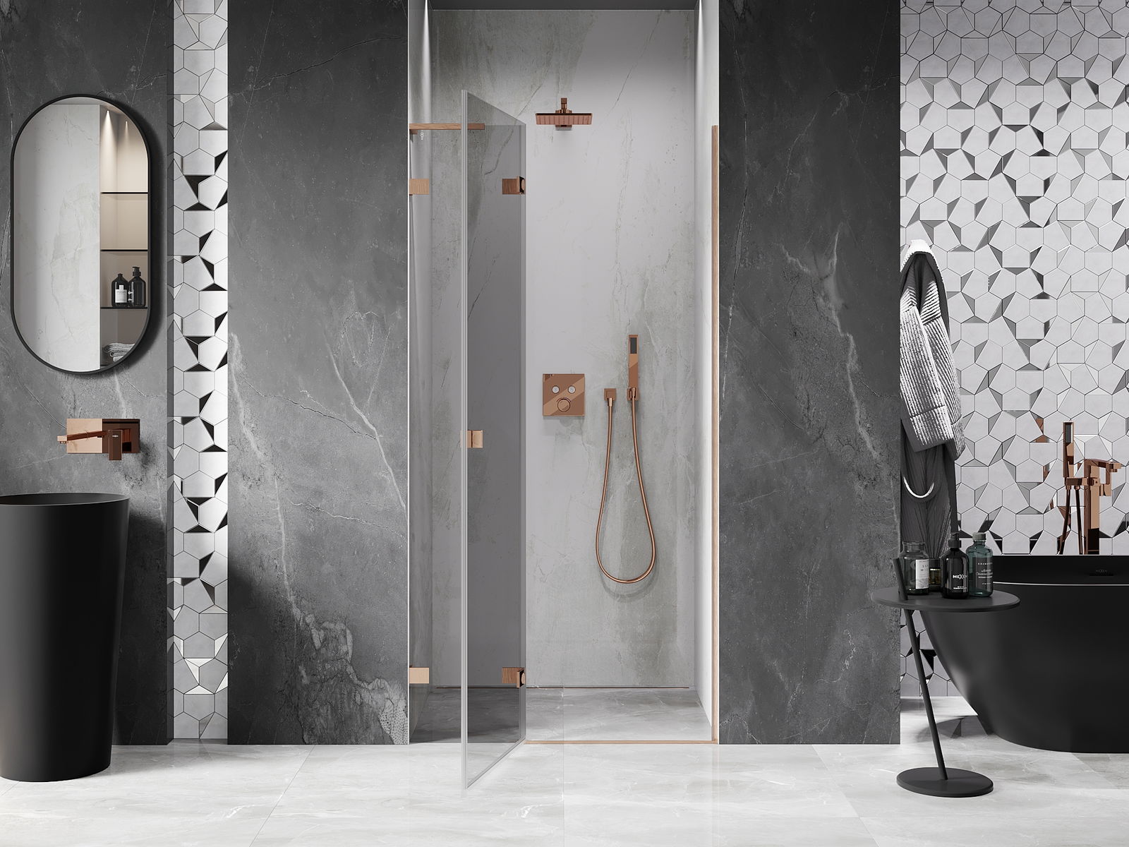 Spony a závěsy byly vyrobeny z velmi odolné mosazi a navíc vytvářejí zarovnanou plochu skla. Je to vynikající volba, která kombinuje eleganci, odolnost a moderní design. Díky těmto řešením získává sprcha na estetice a zároveň usnadňuje udržování čistoty.