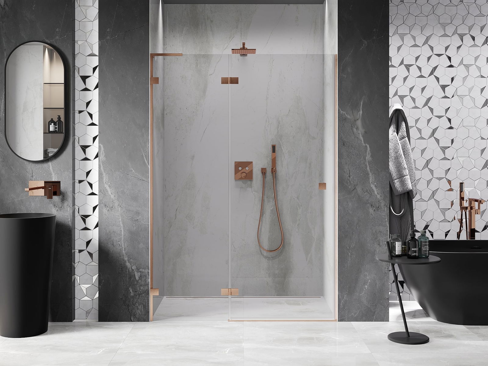 Spony a závěsy byly vyrobeny z velmi odolné mosazi a navíc vytvářejí zarovnanou plochu skla. Je to vynikající volba, která kombinuje eleganci, odolnost a moderní design. Díky těmto řešením získává sprcha na estetice a zároveň usnadňuje udržování čistoty.