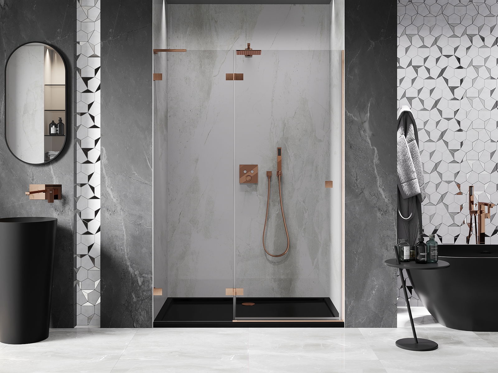 Spony a závěsy byly vyrobeny z velmi odolné mosazi a navíc vytvářejí zarovnanou plochu skla. Je to vynikající volba, která kombinuje eleganci, odolnost a moderní design. Díky těmto řešením získává sprcha na estetice a zároveň usnadňuje udržování čistoty.