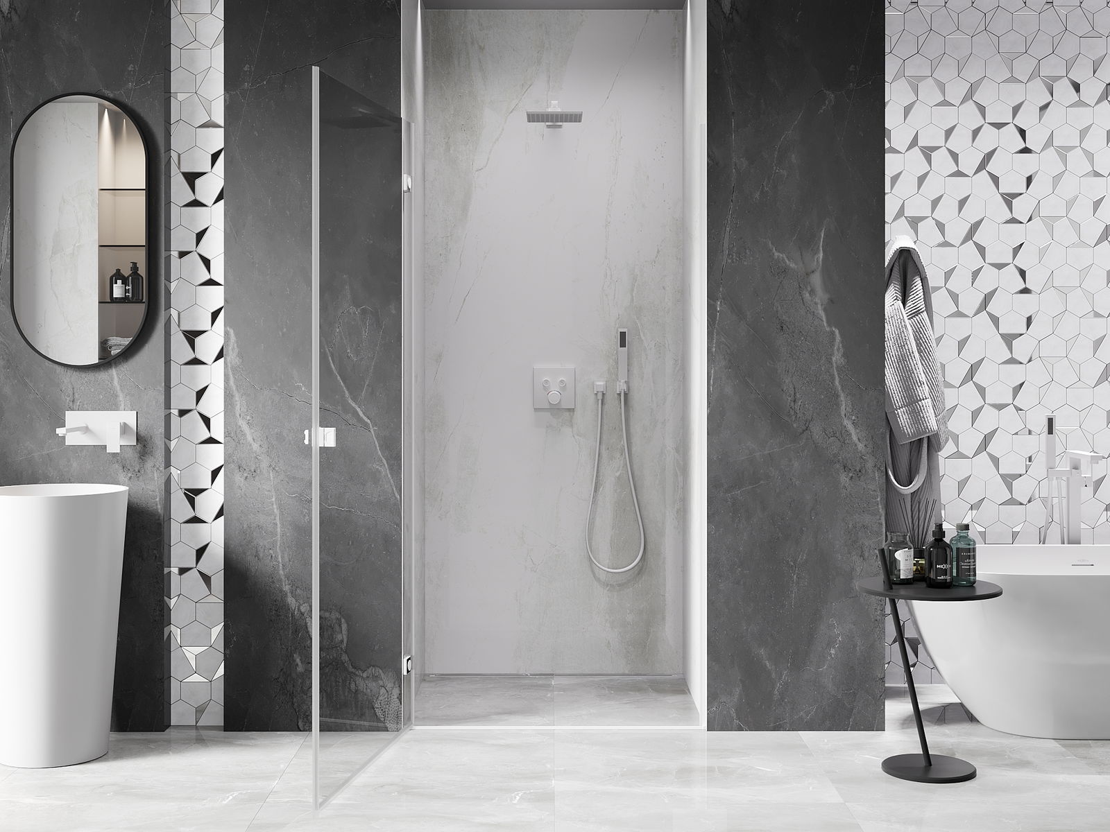 Praktická a pohodlná rukojeť je vyrobena z odolného a trvanlivého kovu. Moderní tvar ve spojení s povrchovou úpravou, která ladí s barvou profilů, dodává celku moderní a stylový vzhled, zdůrazňující estetiku každé koupelny.
