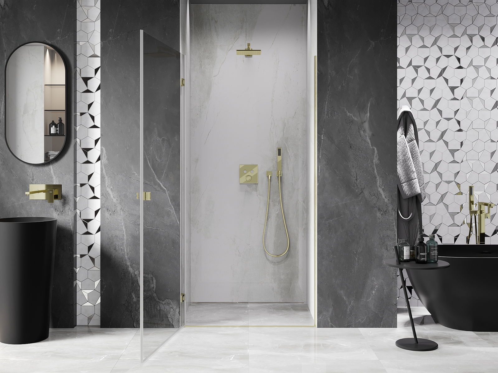 Praktická a pohodlná rukojeť je vyrobena z odolného a trvanlivého kovu. Moderní tvar ve spojení s povrchovou úpravou, která ladí s barvou profilů, dodává celku moderní a stylový vzhled, zdůrazňující estetiku každé koupelny.