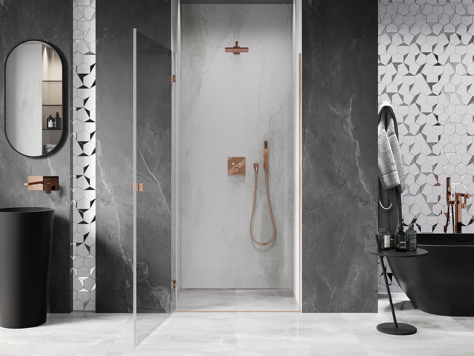 Praktická a pohodlná rukojeť je vyrobena z odolného a trvanlivého kovu. Moderní tvar ve spojení s povrchovou úpravou, která ladí s barvou profilů, dodává celku moderní a stylový vzhled, zdůrazňující estetiku každé koupelny.